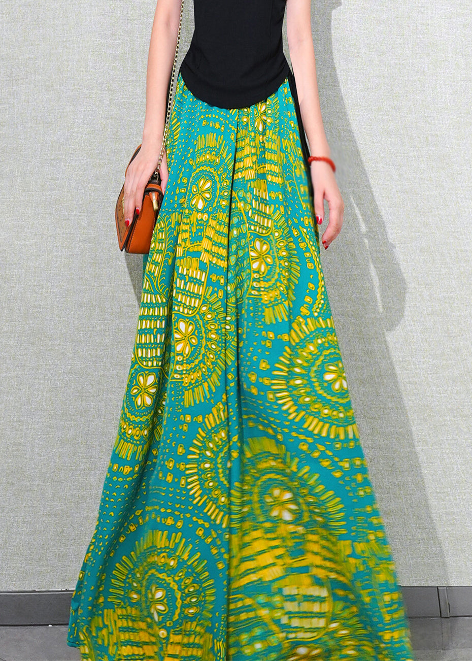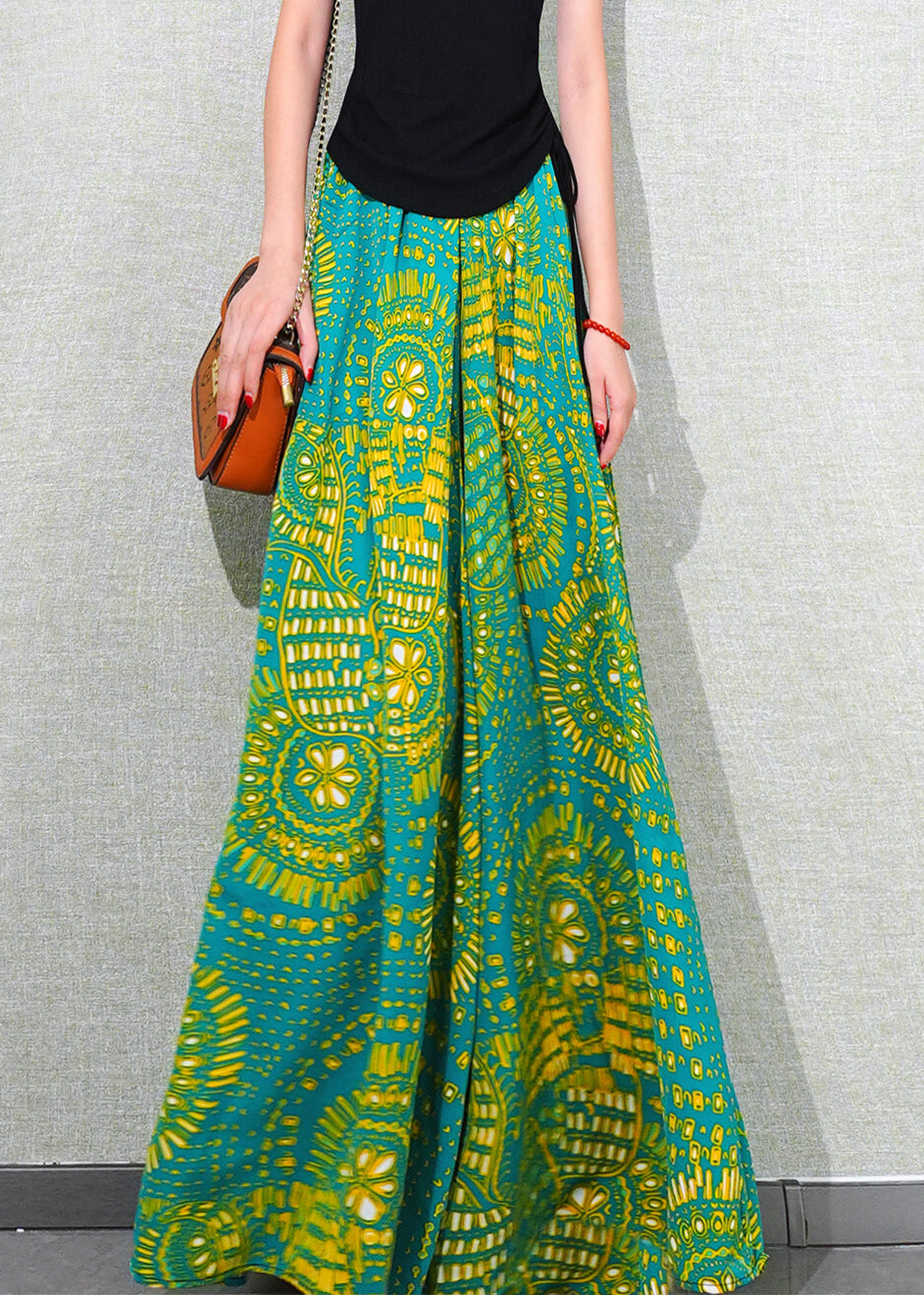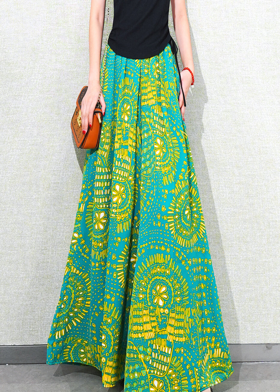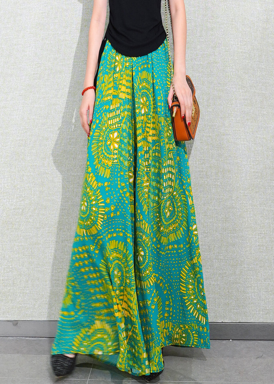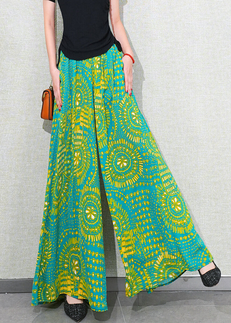 Green Print Pockets Chiffon Summer Wide Leg Pants