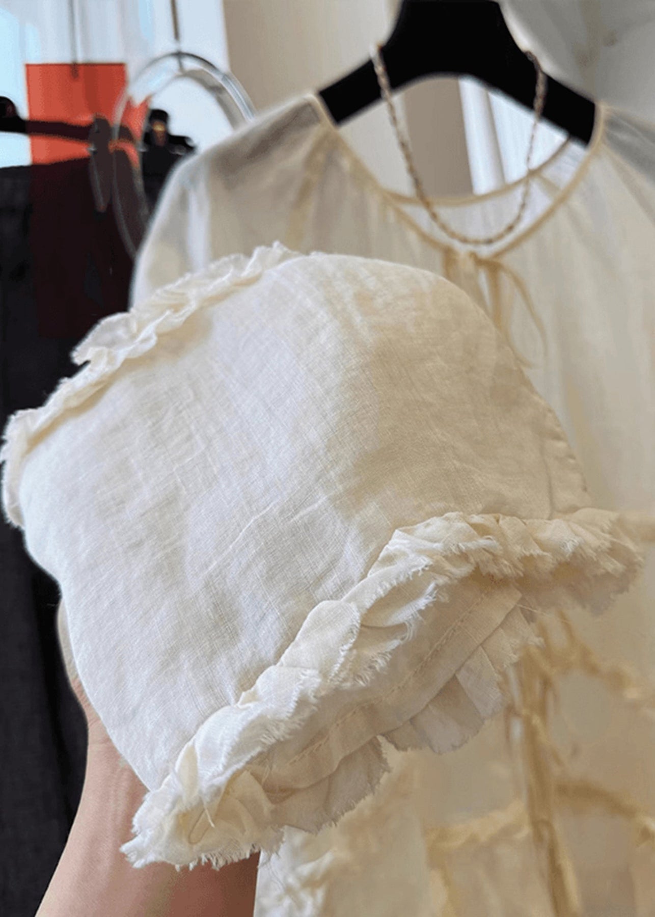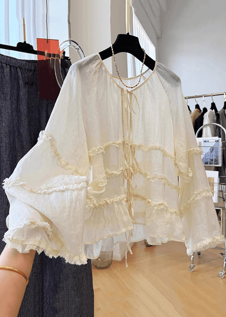 Loose Apricot Ruffled Lace Up Cotton Shirts Fall
