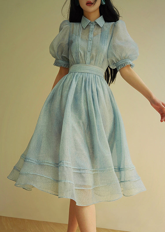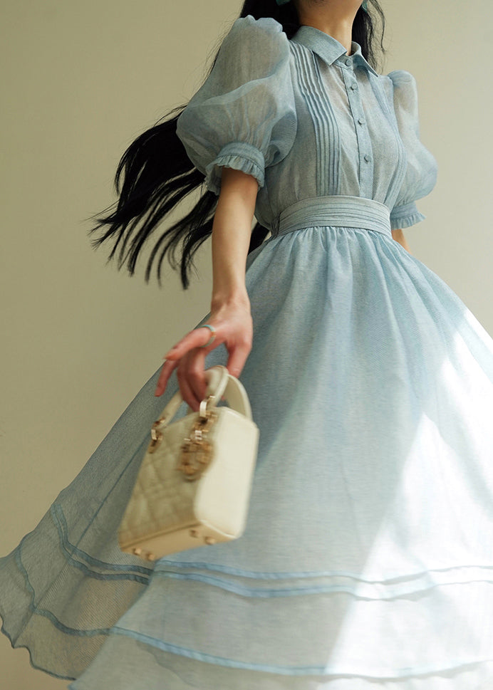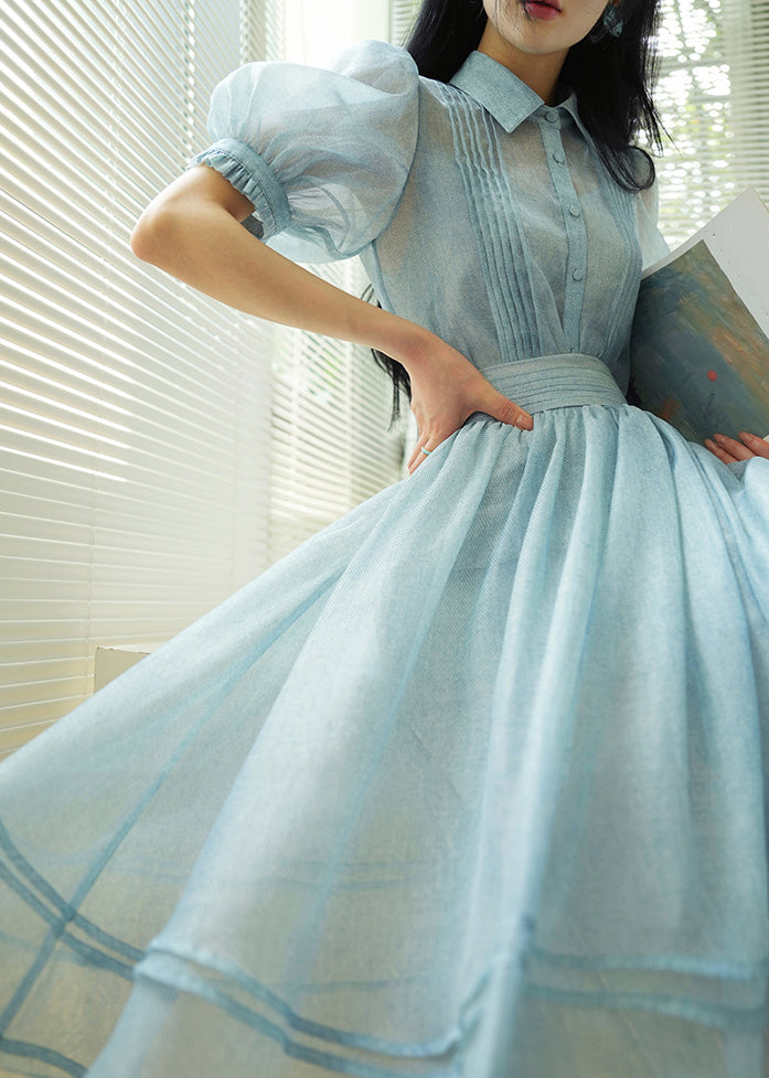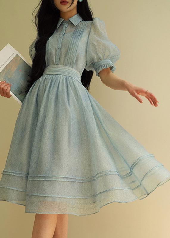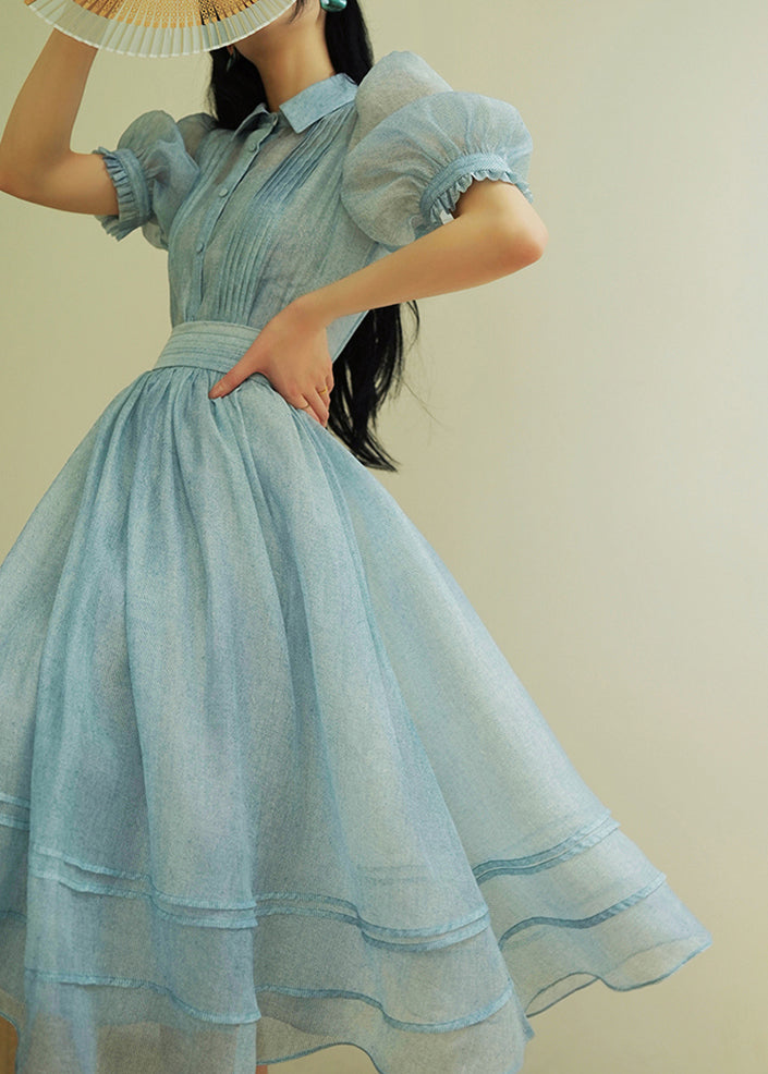 Natural Blue Peter Pan Collar Striped Button Tulle Shirts And Skirts Two Piece Set Summer