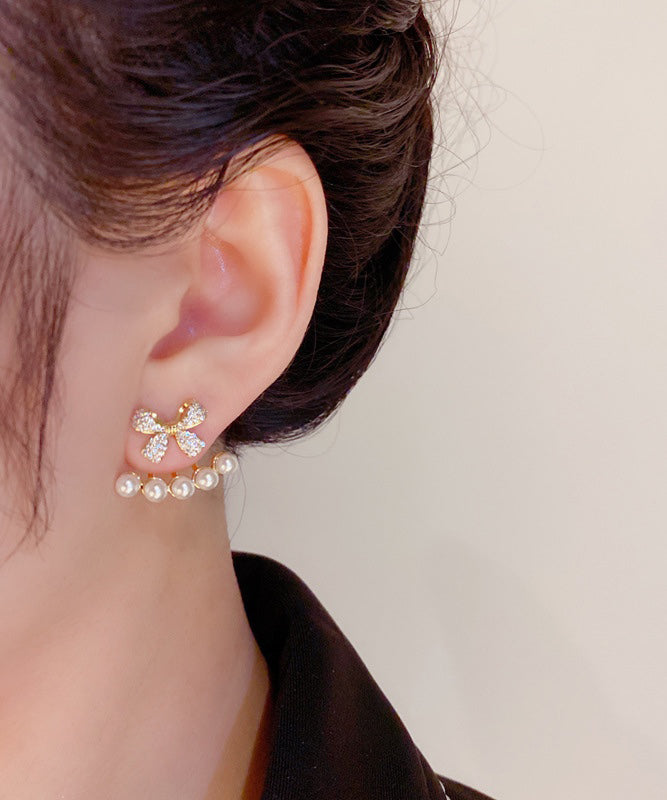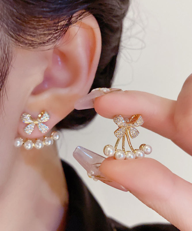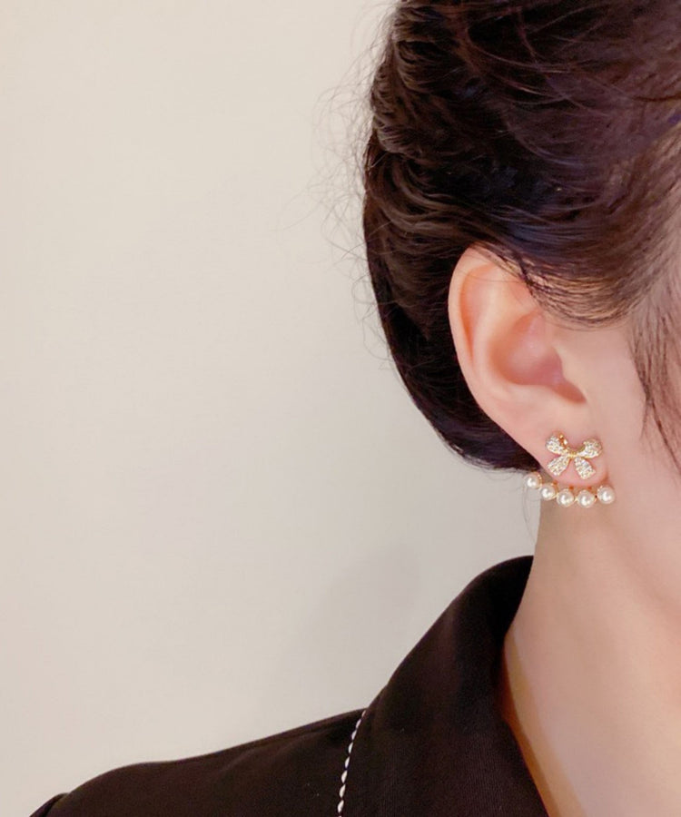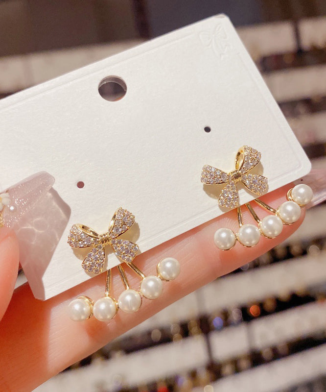 Stylish Gold Copper Overgild Zircon Bow Pearl Stud Earrings