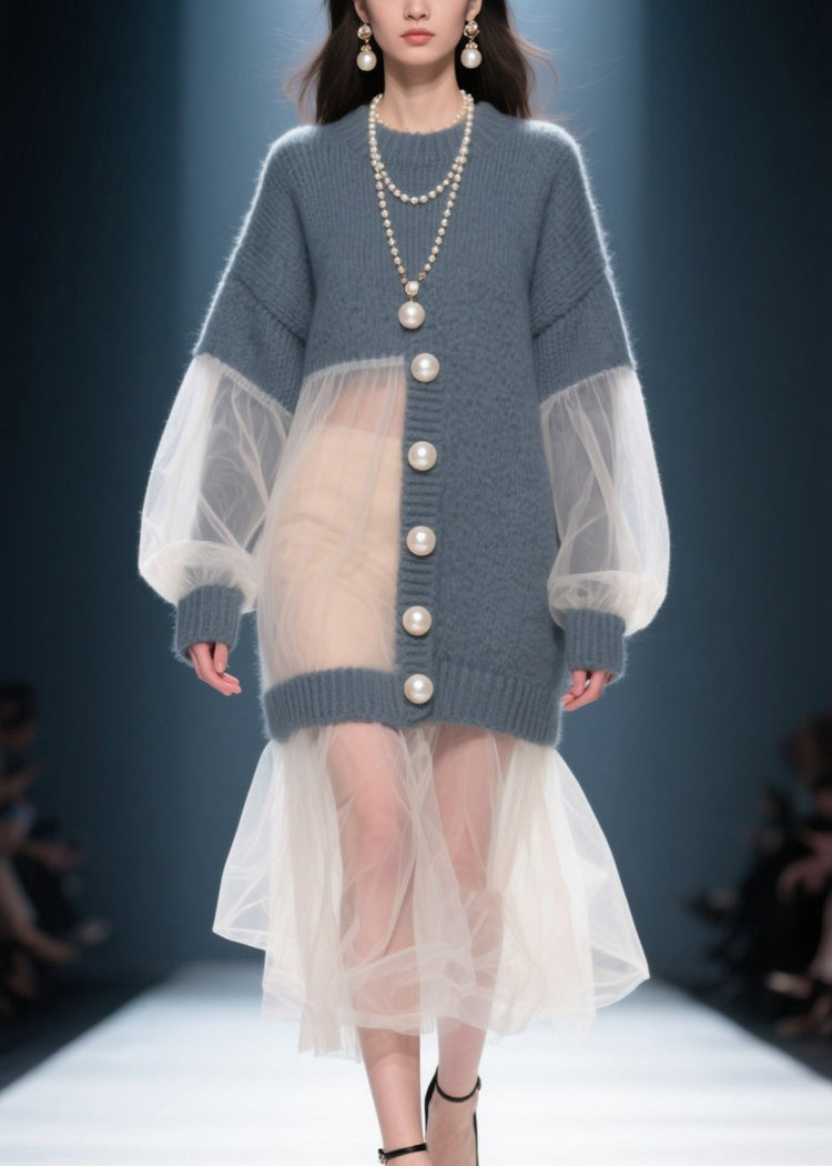 Art Grey O Neck Tulle Patchwork Knit Sweater Dress Fall