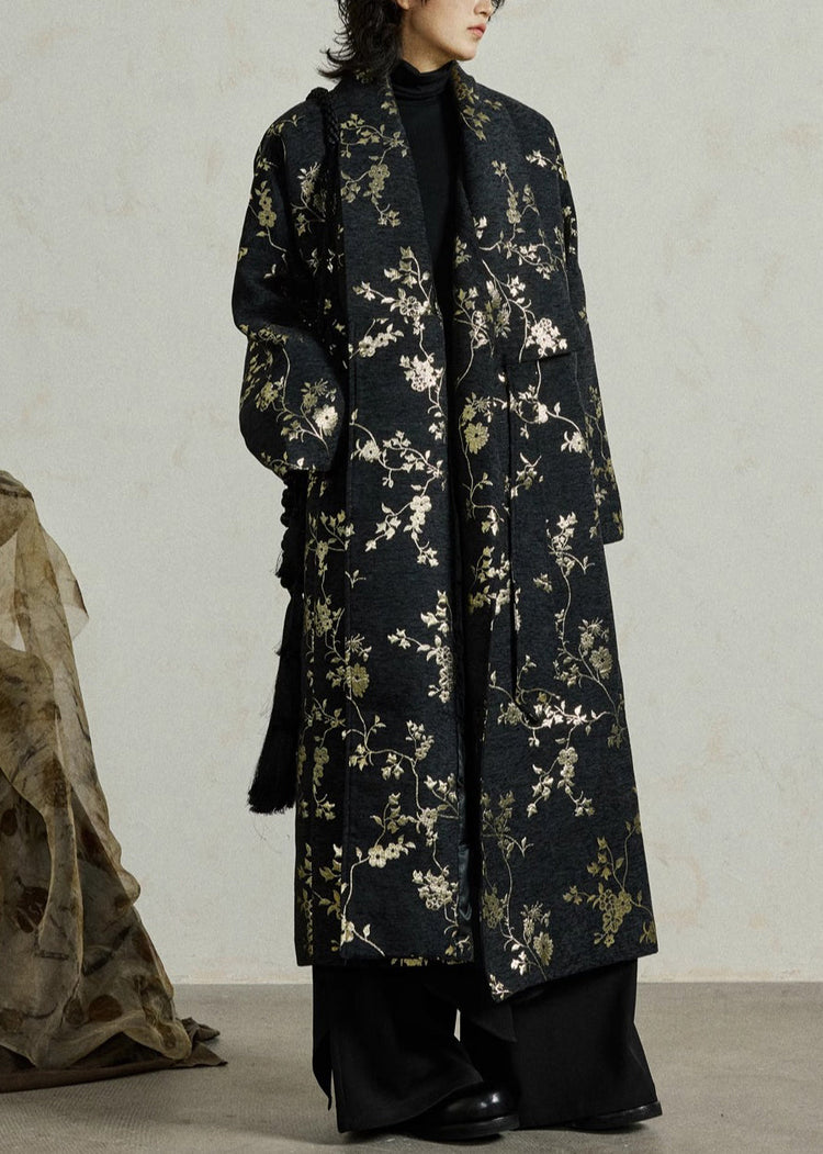 Jacquard Black Lace Up Pockets Cotton Long Coats Fall