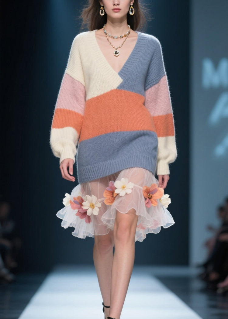 Loose Colorblock V Neck Knit Sweater Top Fall
