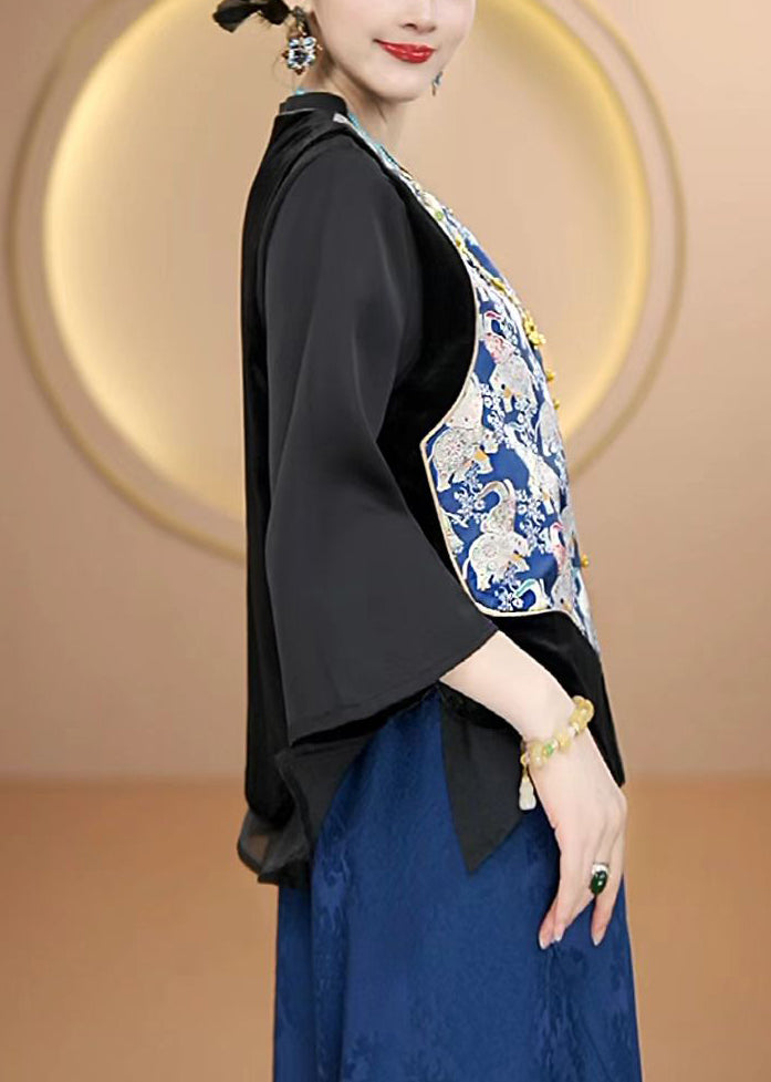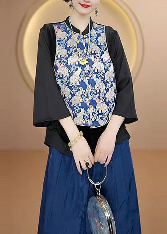 New Chinese Style Blue O Neck Print Silk Vest Sleeveless