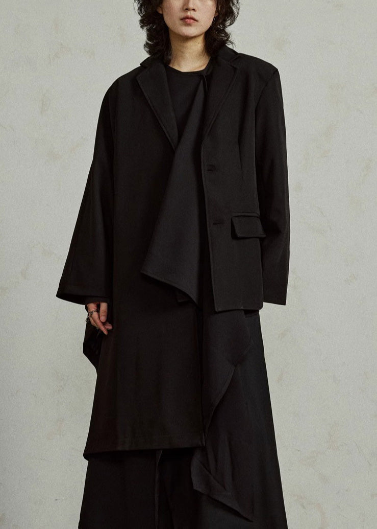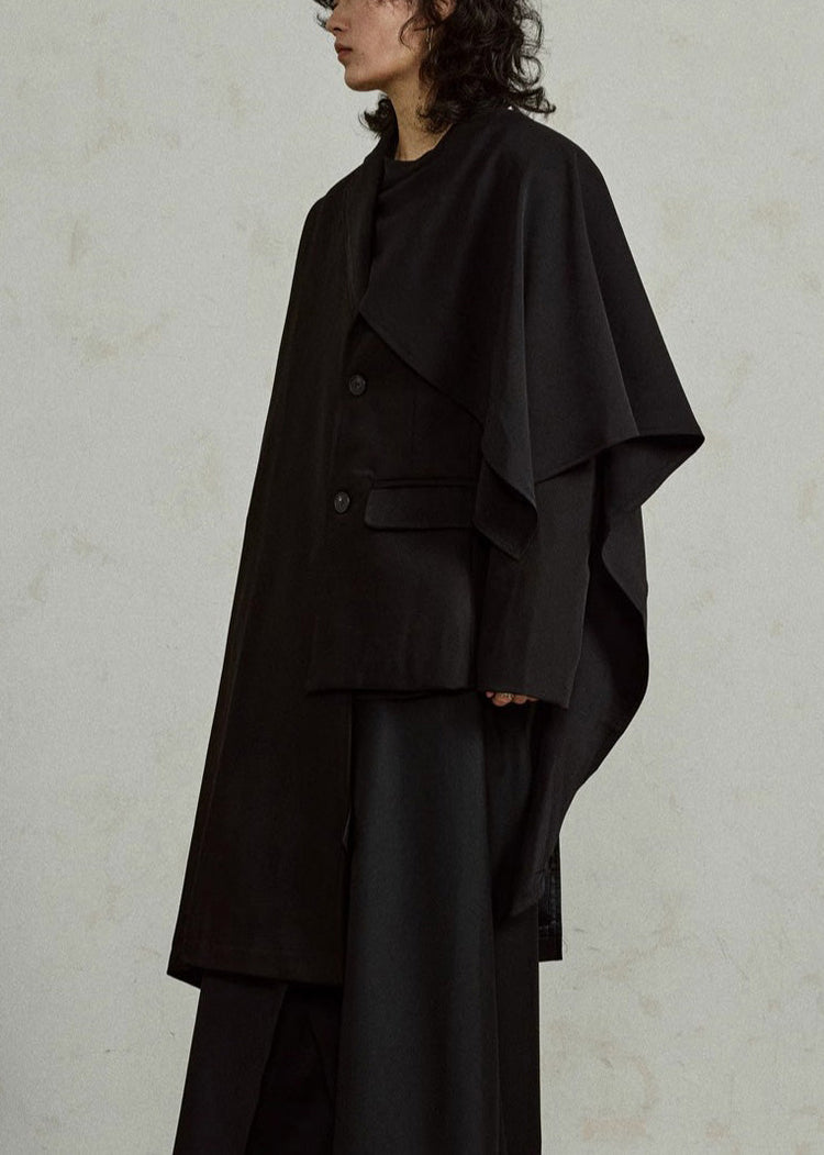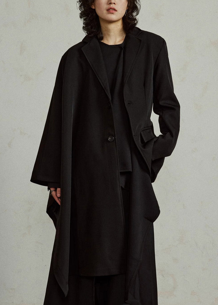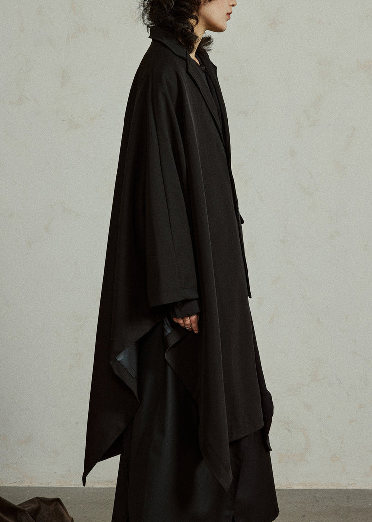 Unique Black Notched Asymmetrical Pockets Long Coats Cloak Sleeves