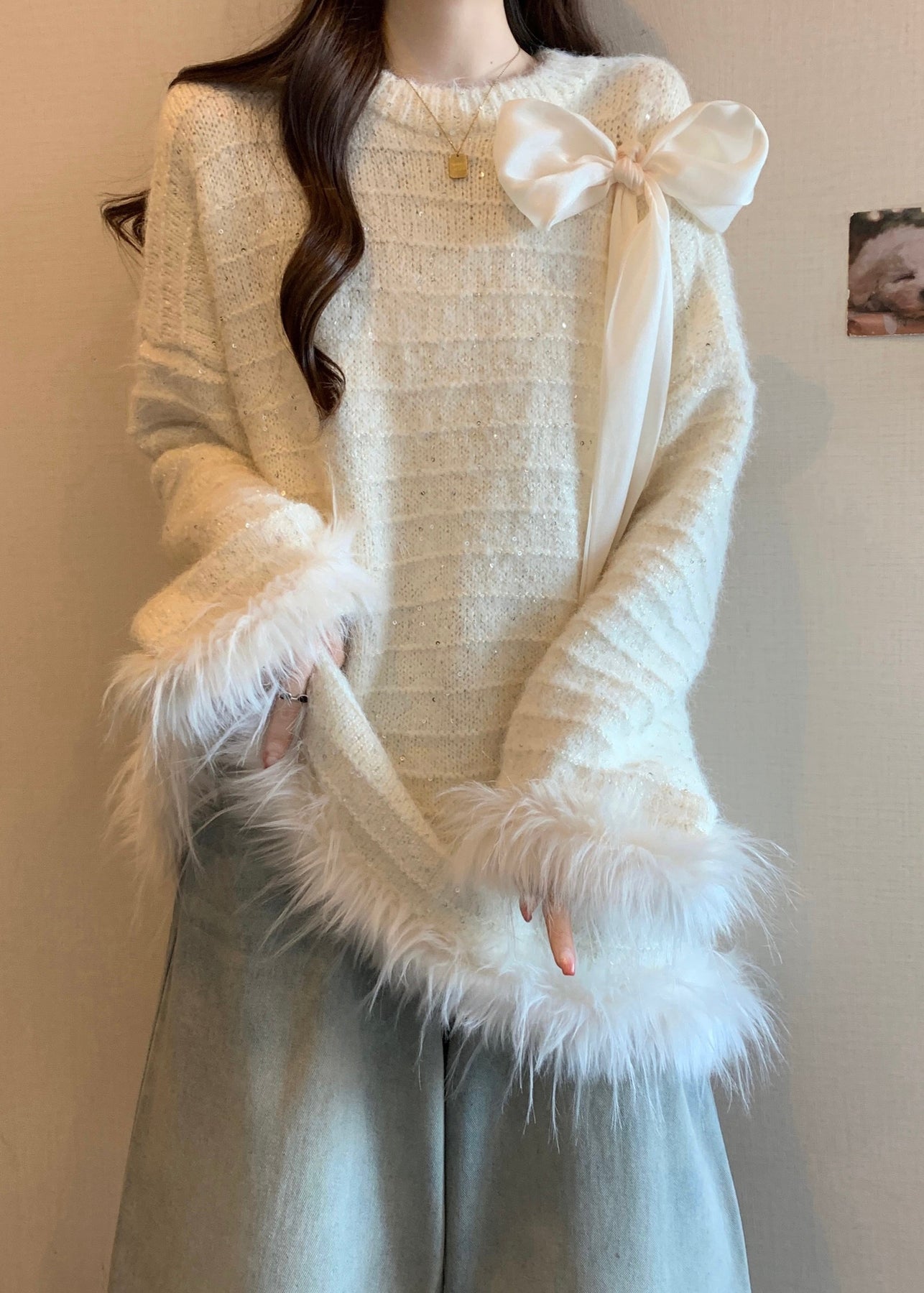White Patchwork Faux Fur Knit Trendy Sweaters Oversized Fall