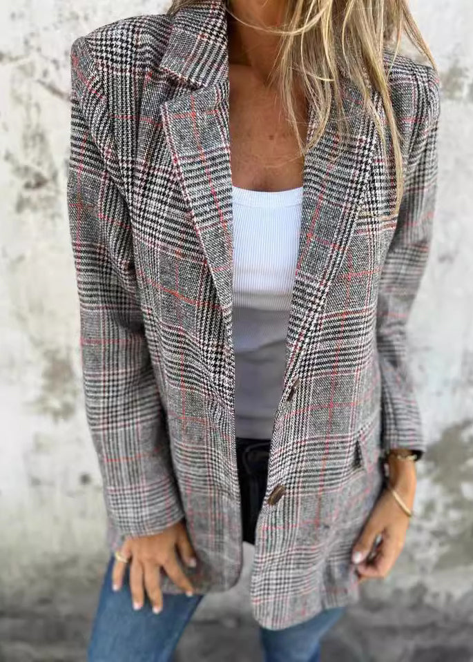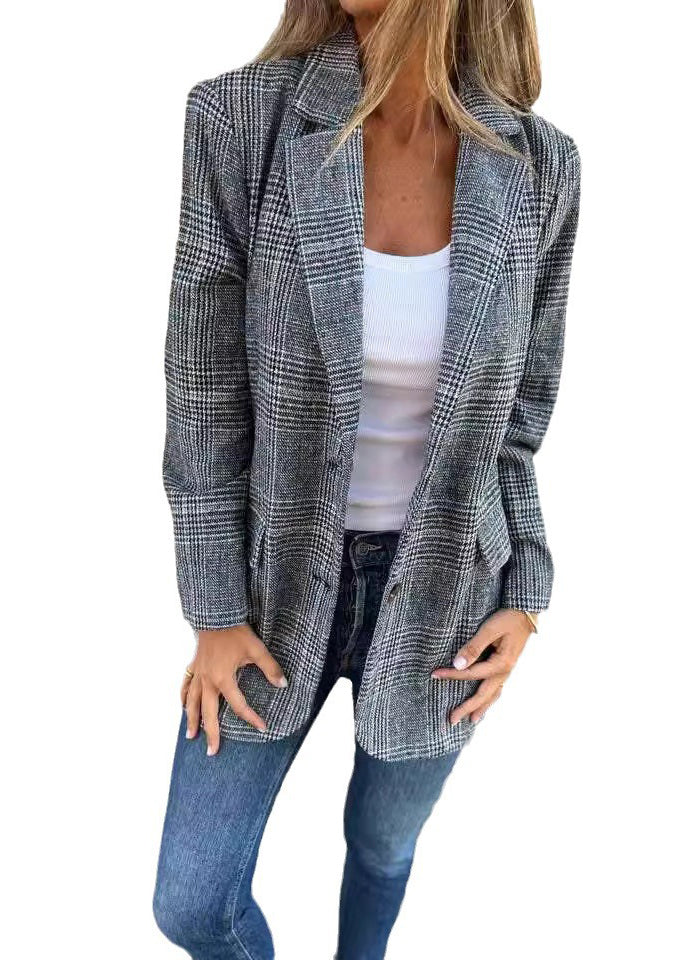 Women Blue Notched Pockets Plaid Cotton Suit Coats Fall