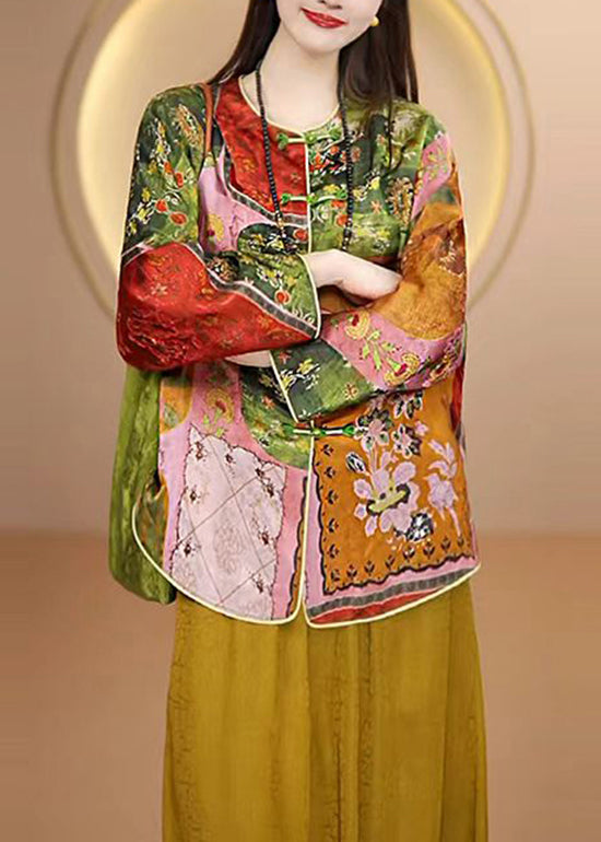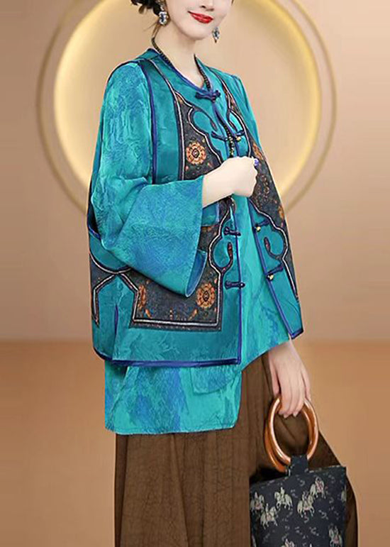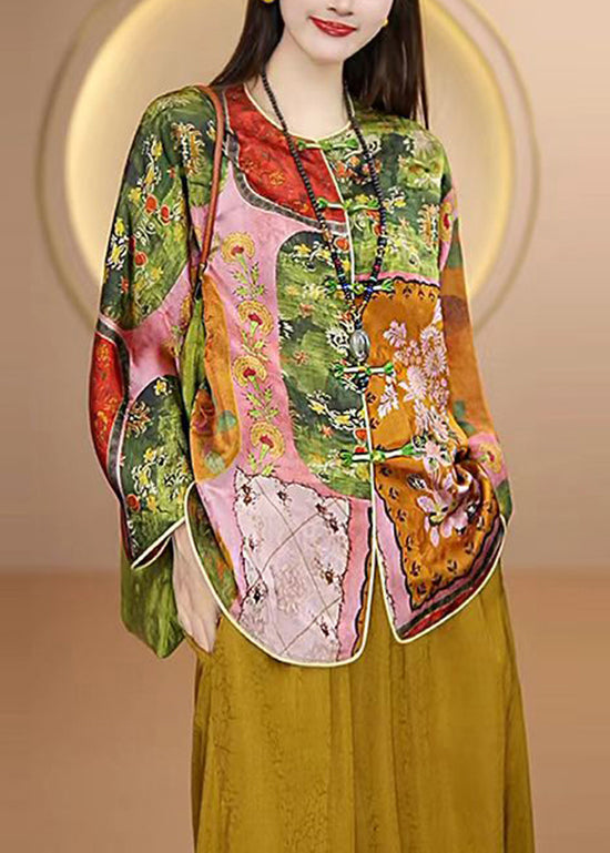 Retro Green O Neck Print Chinese Button Silk Coats Fall
