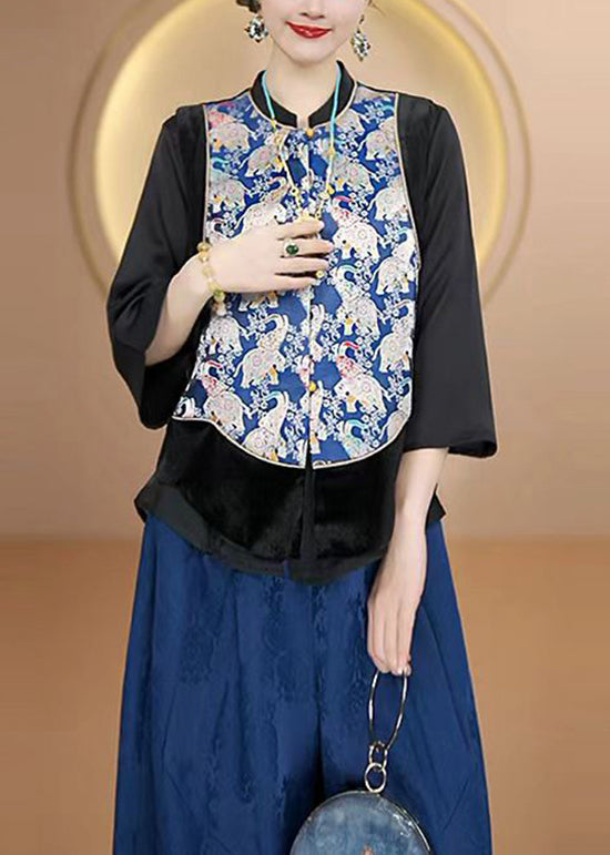 Women Blue O Neck Oriental Button Silk Vest Sleeveless