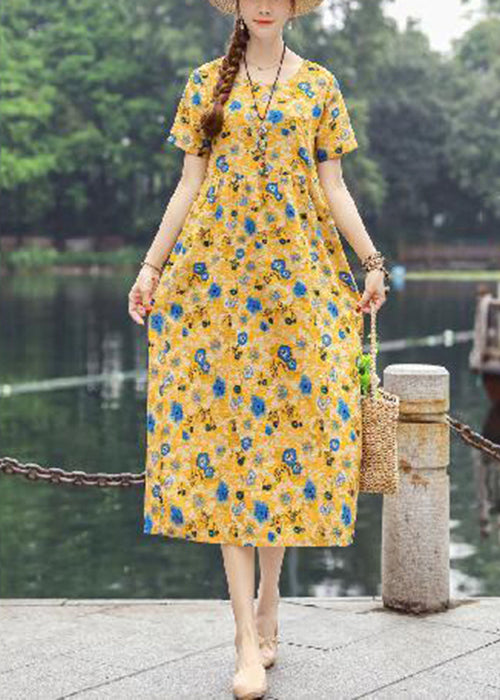 Bohemian Yellow O-Neck Print Cotton Dresses Short Sleeve