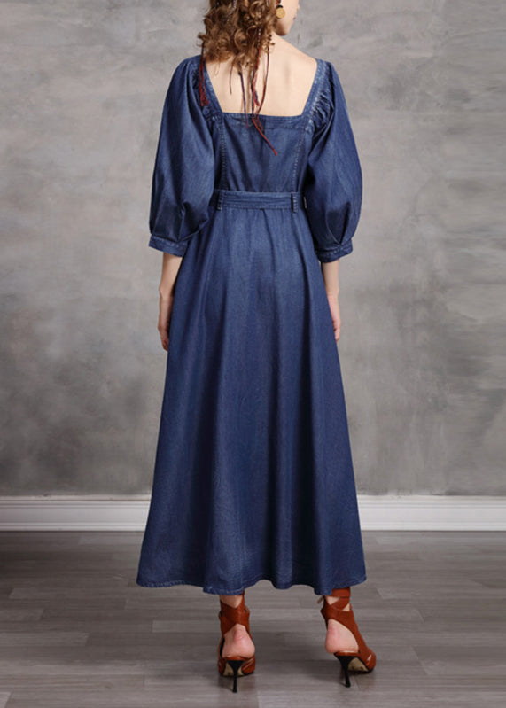 Simple Blue Square Collar Patchwork Pockets Long Denim Dresses Bracelet Sleeve