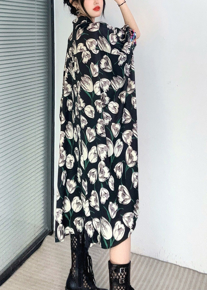 Dark Gray Zippered Print Cotton Dress Hooded Short Sleeve