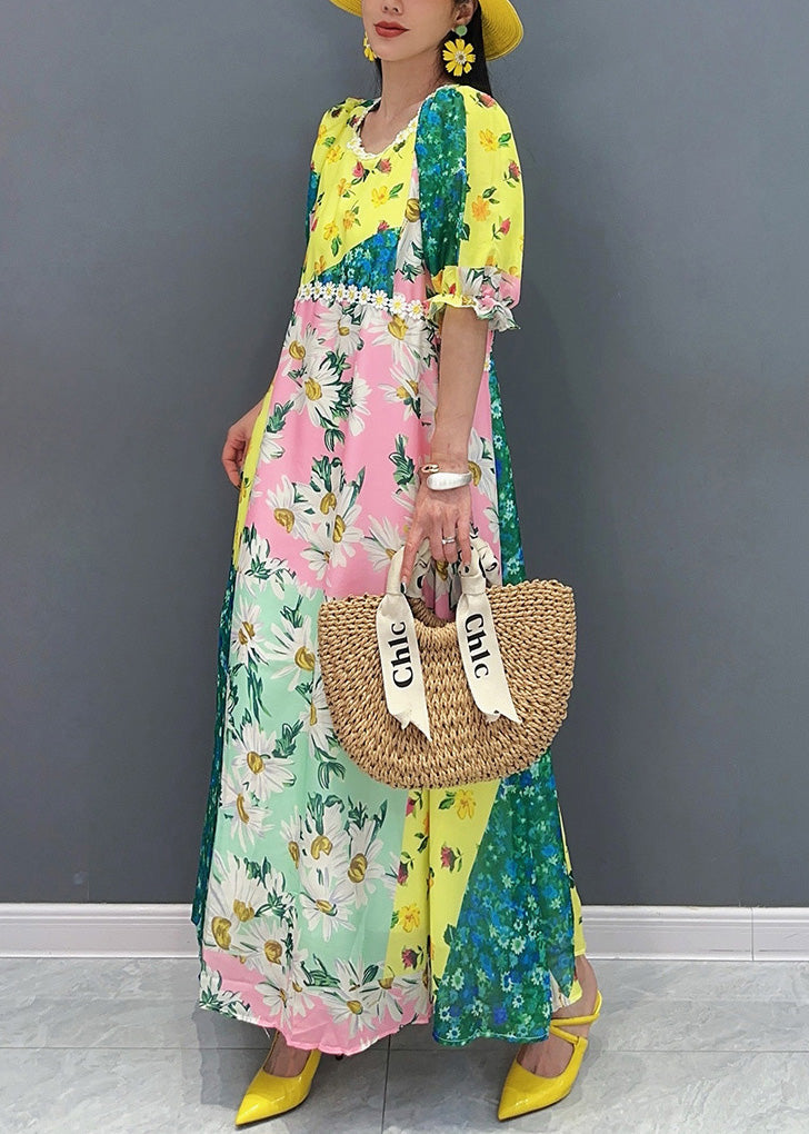 Chic Yellow O-Neck Print Patchwork Cotton Long Dress Summer