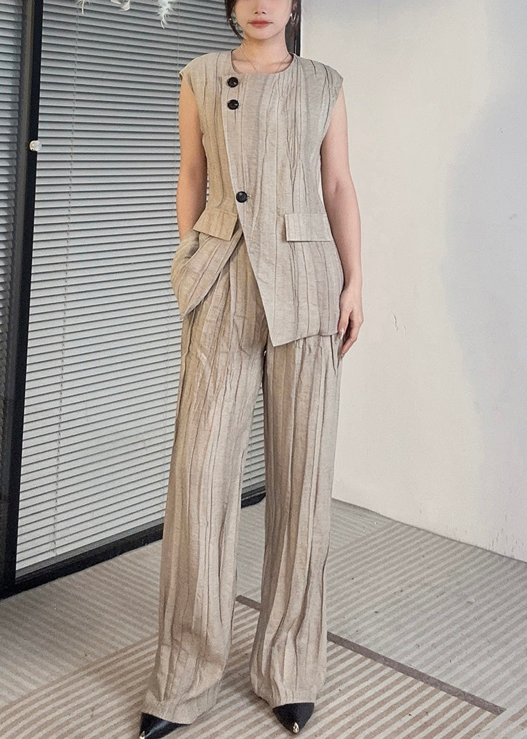 French Khaki Button Pockets Cotton Two Pieces Set Sleeveless