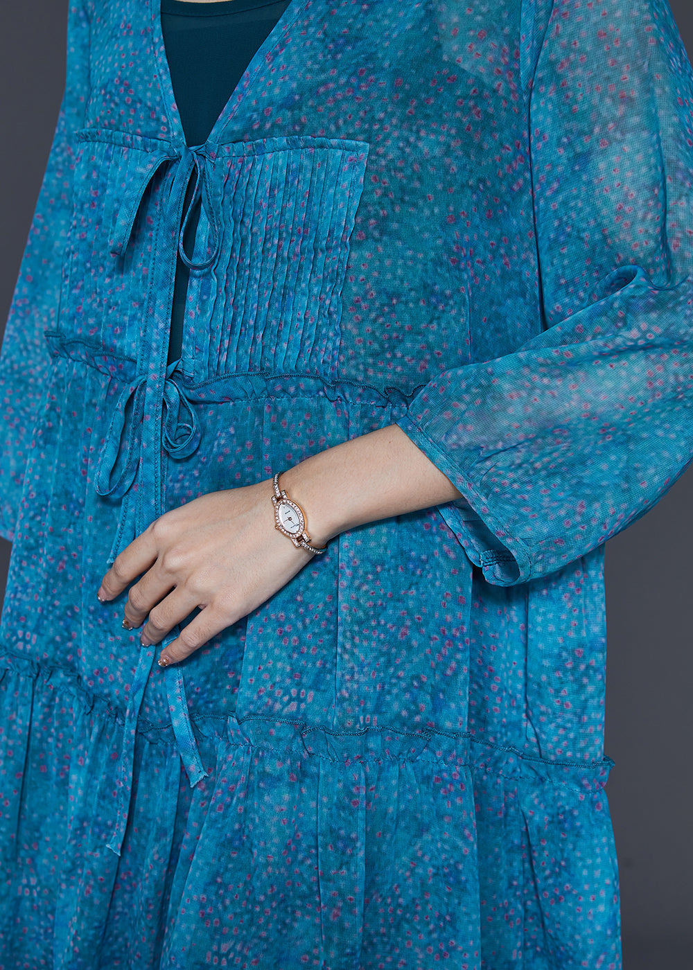 Women Blue Ruffled Print Chiffon Dresses Cloak Sleeves