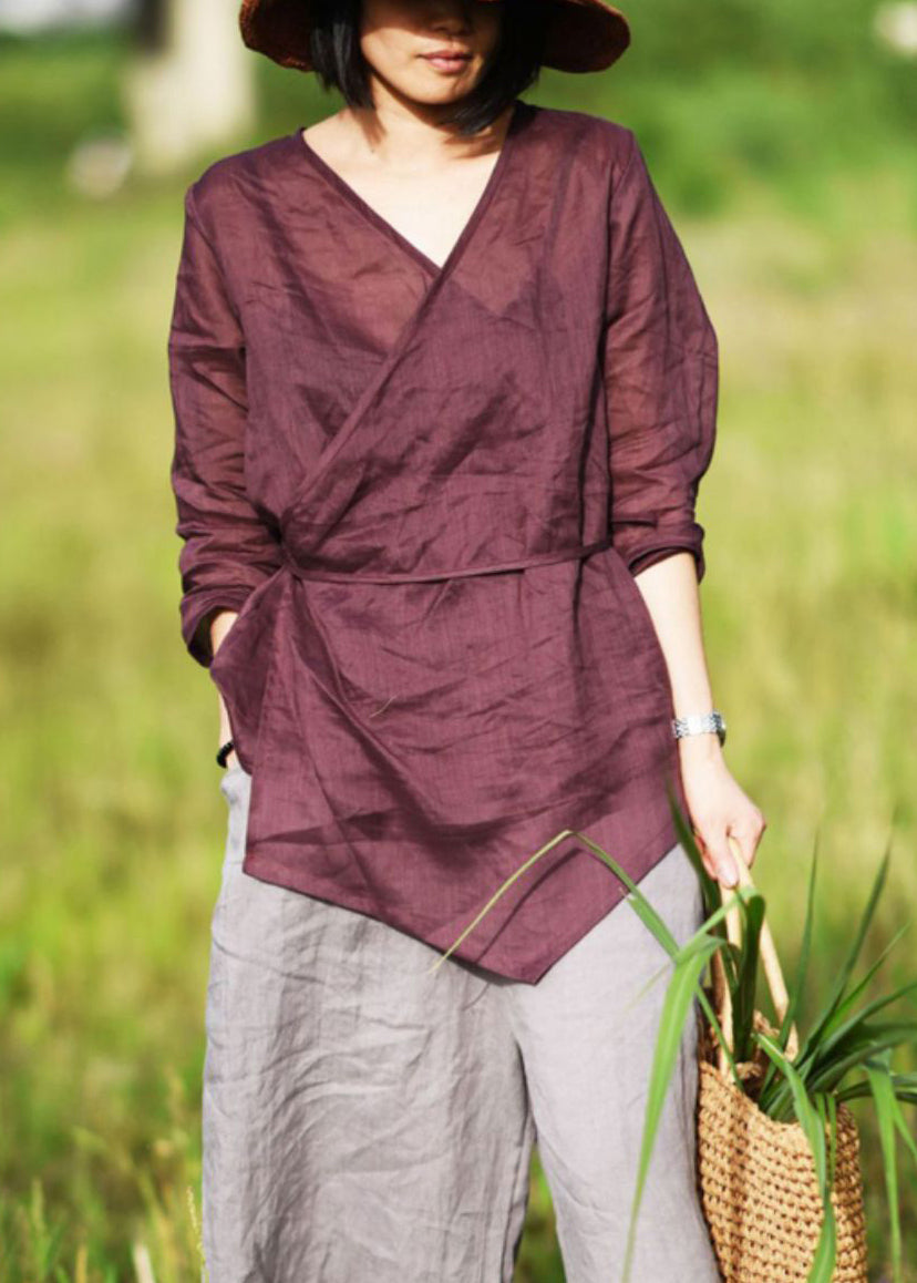 Simple Wine Red V Neck Lace Up Linen Shirts Bracelet Sleeve