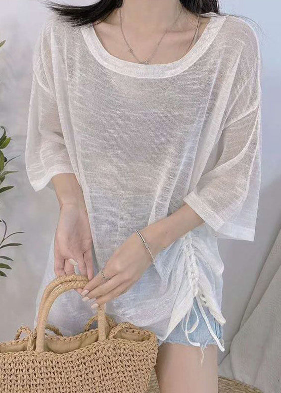 White Lace Up Thin Ice Silk Knit Top O Neck Half Sleeve