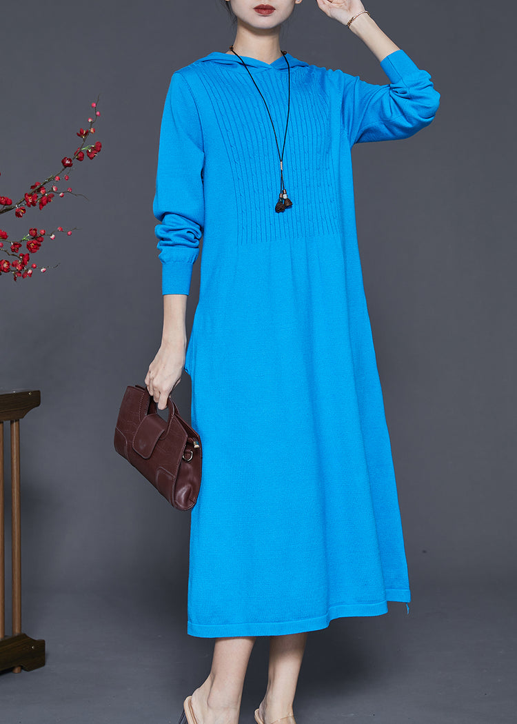 Women Blue Hooded Silm Fit Knit Long Dress Spring