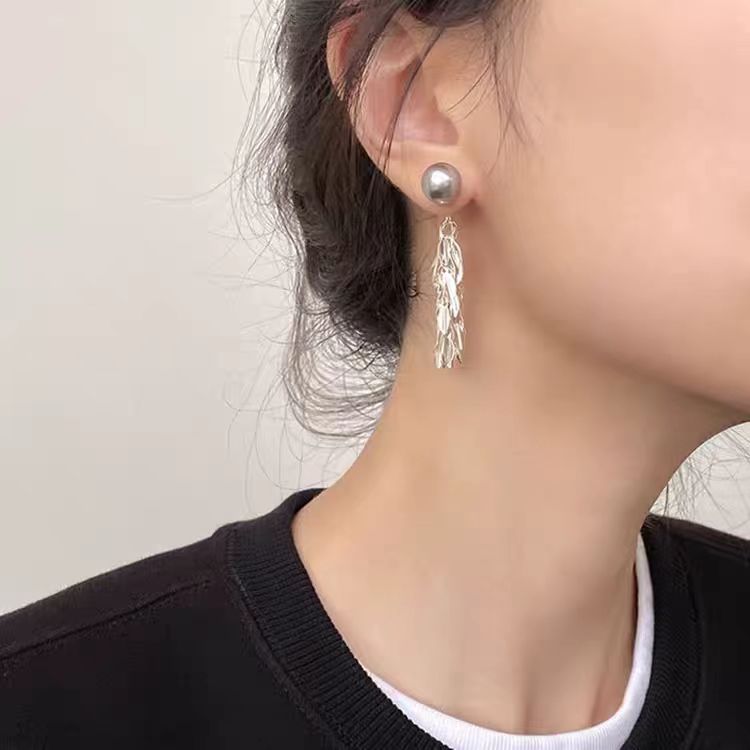 New Grey Copper Silver Plated Pearl Tassel Drop Earrings