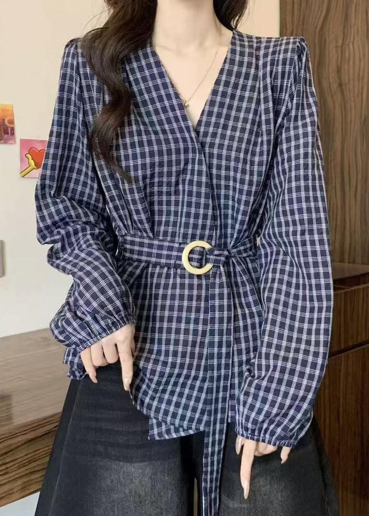 Style Blue V Neck Plaid Lace Up Cotton Shirts Fall
