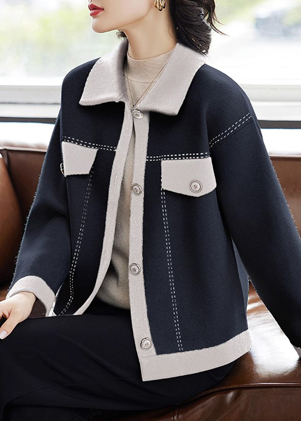 Navy Patchwork Zippered Cotton Knit Coat Fall