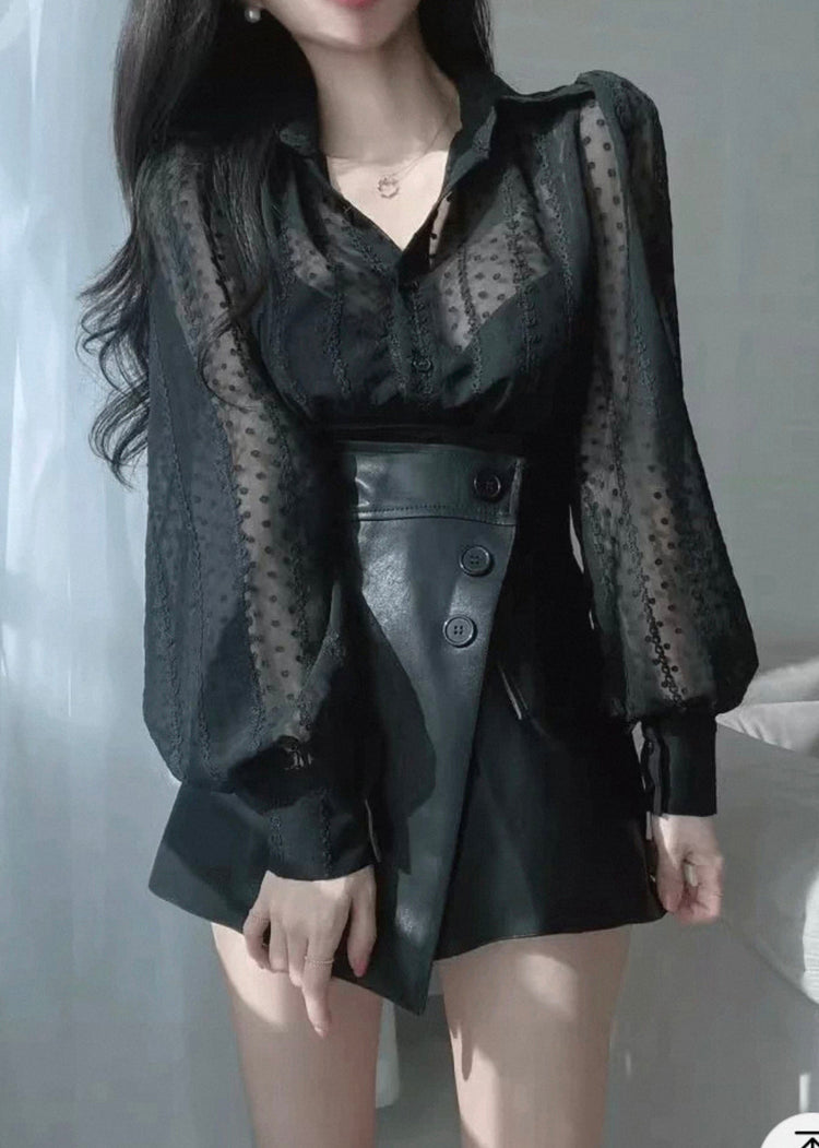 French Black Peter Pan Collar Lace Cotton Blouses Fall