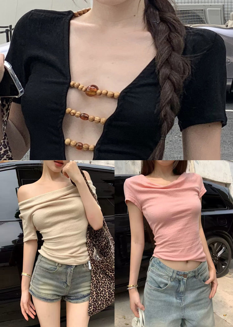 Apricot Wear On Both Sides BeadingPatchwork Cotton T Shirts Slash Neck