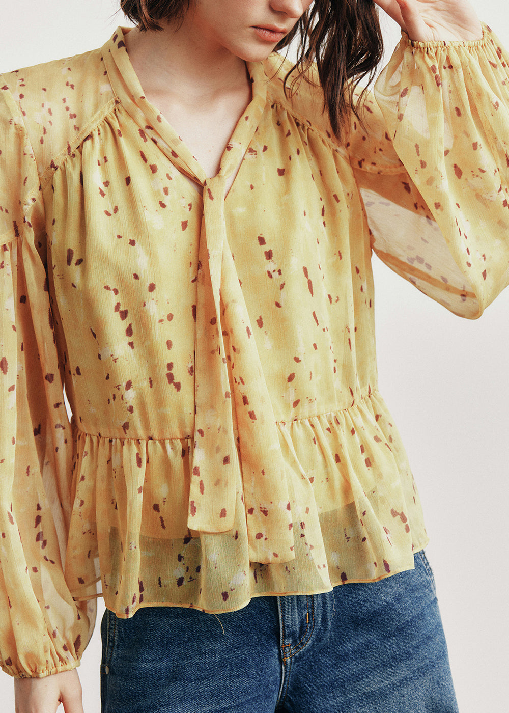 French Yellow V Neck Print Cotton Blouses Lantern Sleeve