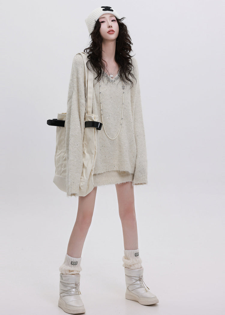 Boutique White Sequins Warm Knit Sweater And Skirt Two Piece Set Winter