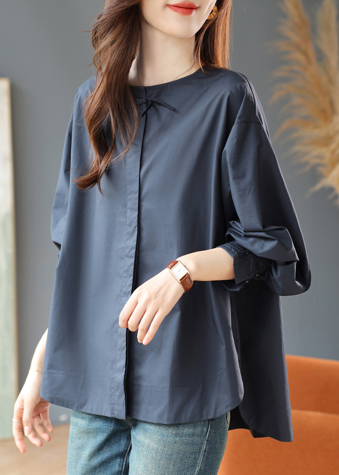 Loose Navy O Neck Side Open Cotton Blouse Fall