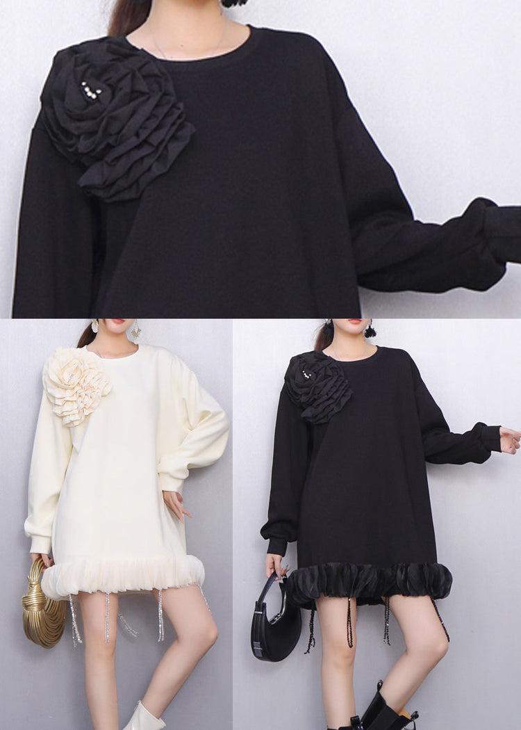 White Floral Decorated Cotton Day Dress Tasseled Spring