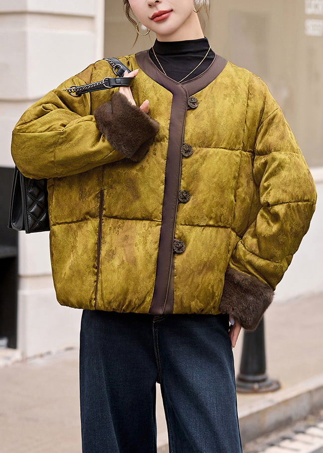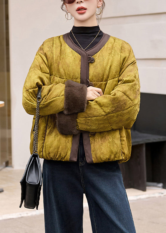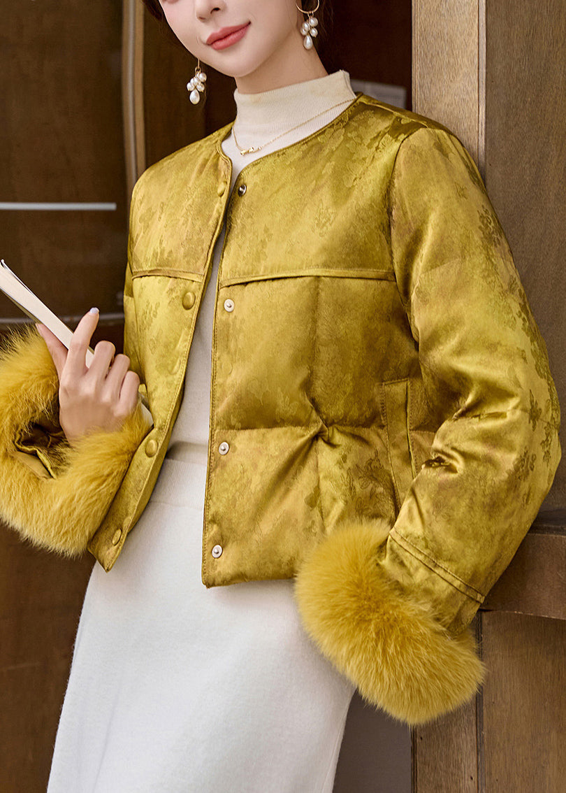 Chinese Style Yellow Jacquard Fur Patchwork Duck Down Coat Winter