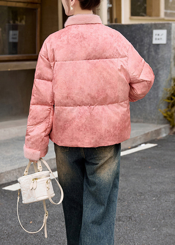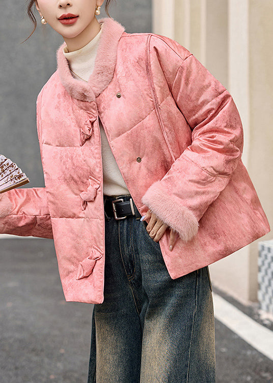 New Retro Pink O Neck Fur Patchwork Duck Down Winter Short Coats