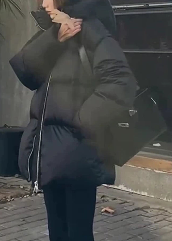 Black Zippered Patchwork Hooded Down Coats Lantern Sleeve