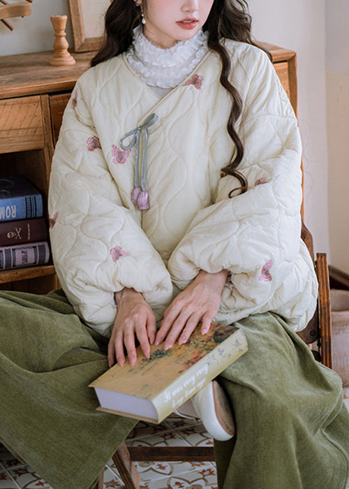 Loose Beige V Neck Butterfly Bow Cotton Filled Parkas Winter