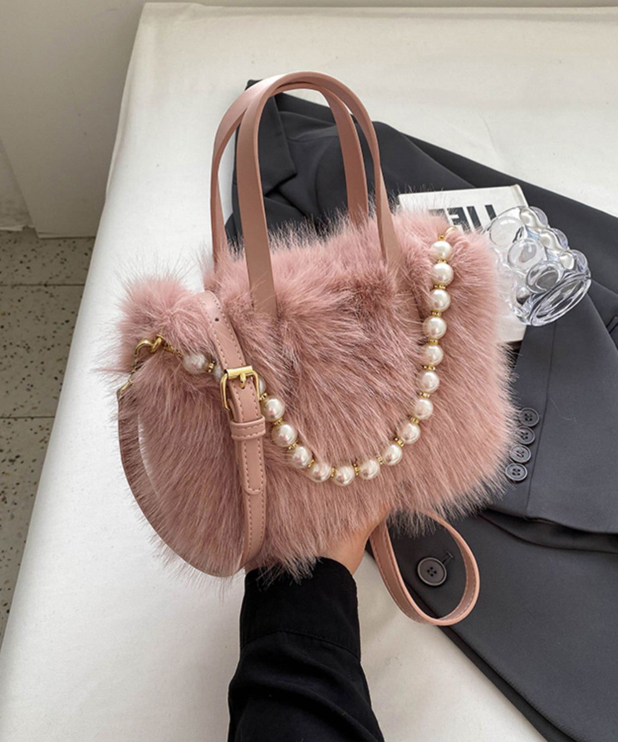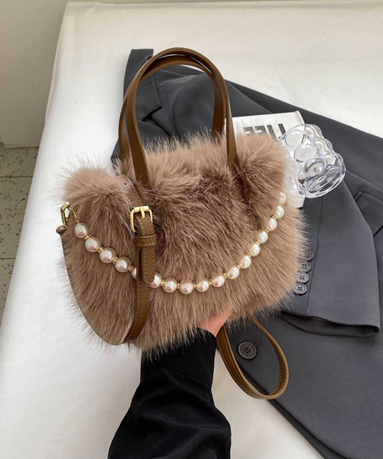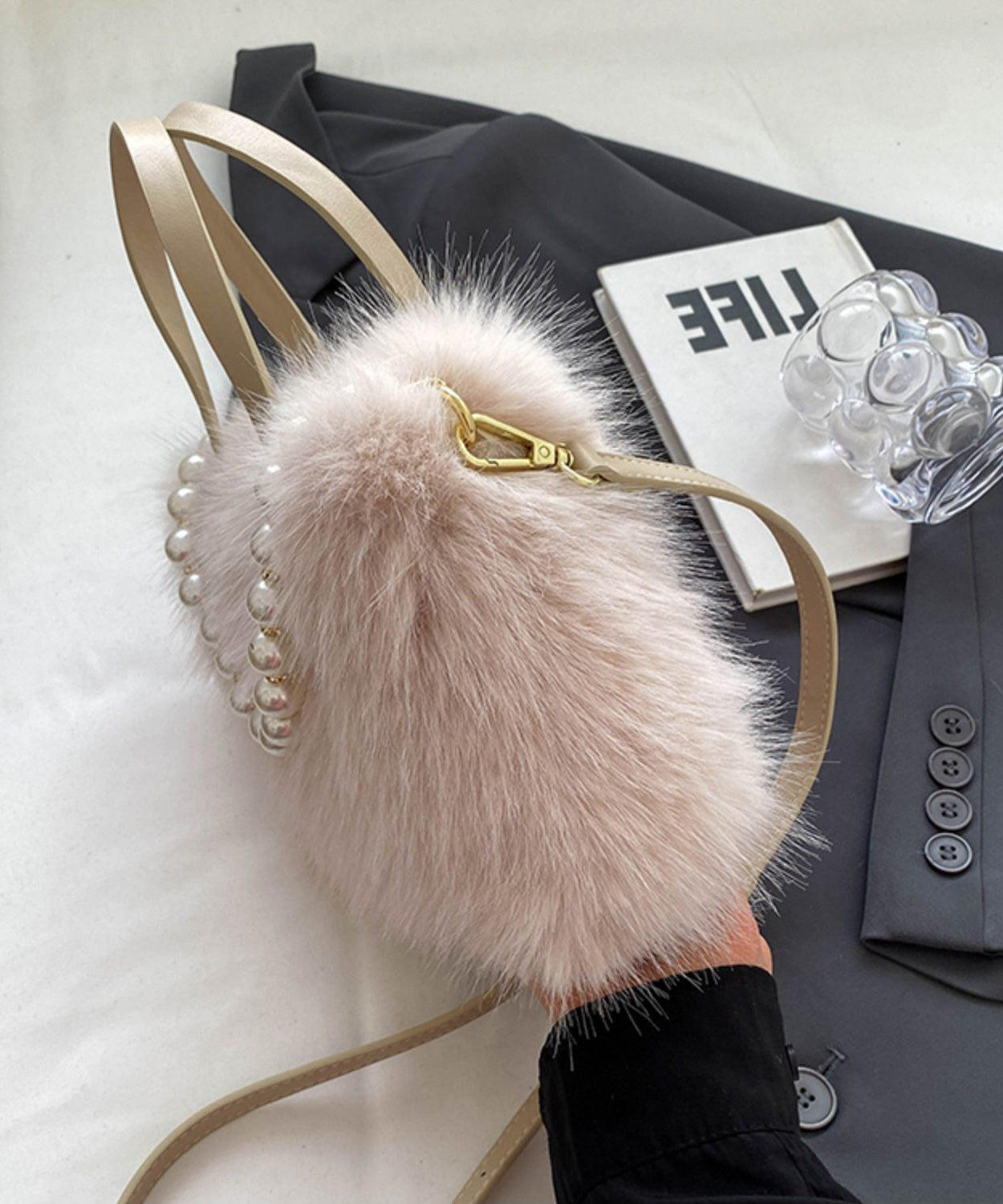 New Fashion Beige Pearl Fuzzy Fur Fluffy Square Crossbody Bag