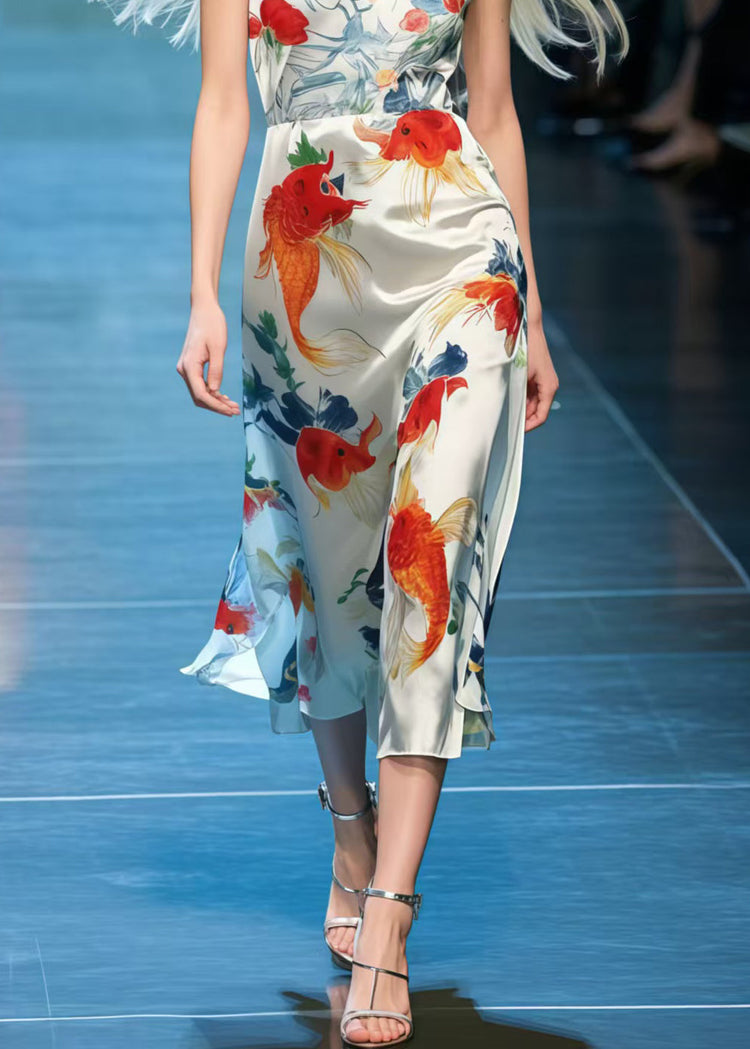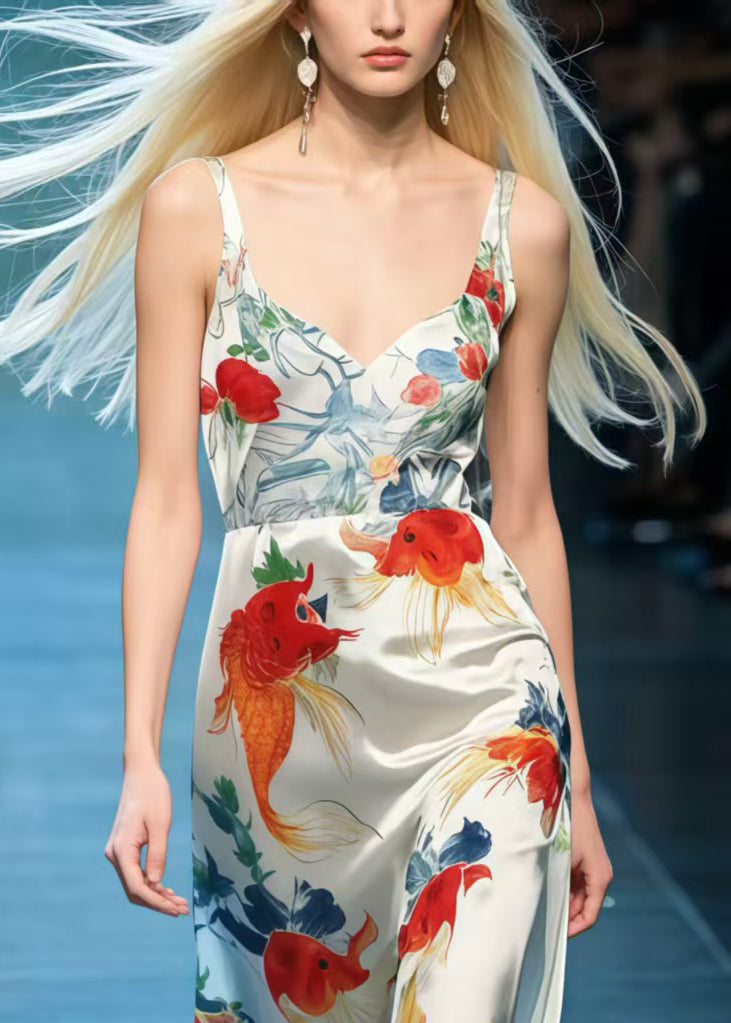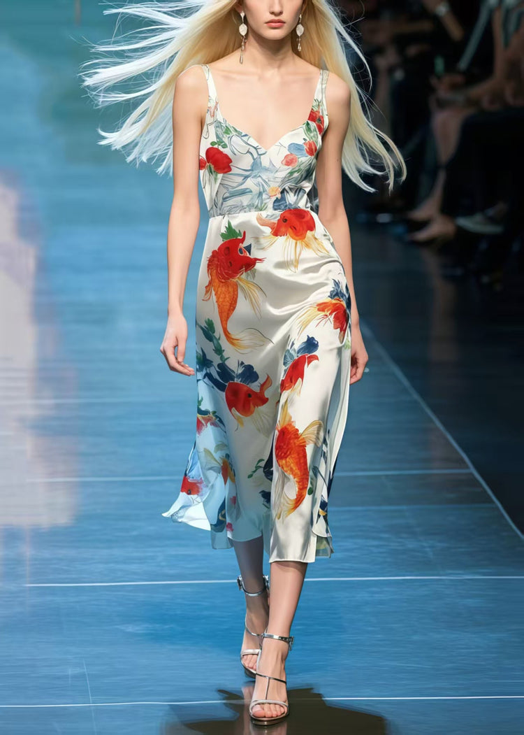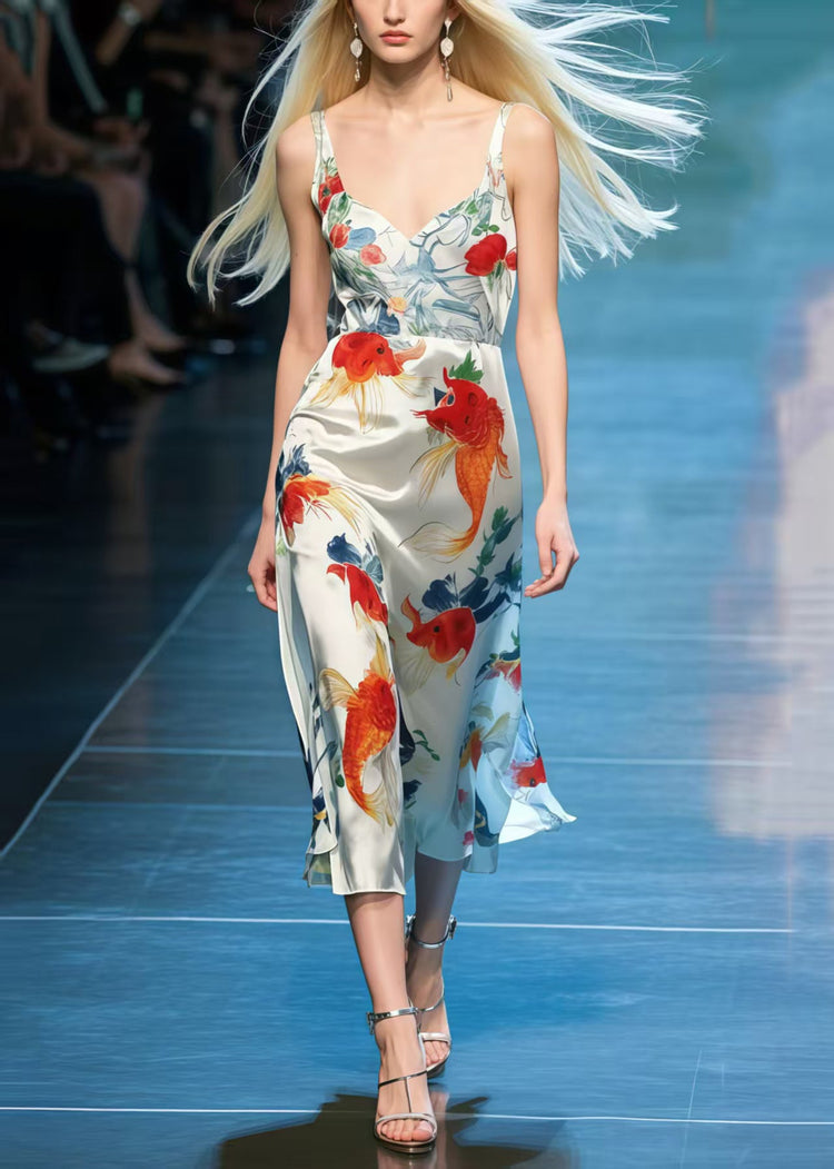Beautiful Koi Fish Print Draping Silk Cami Dresses Summer