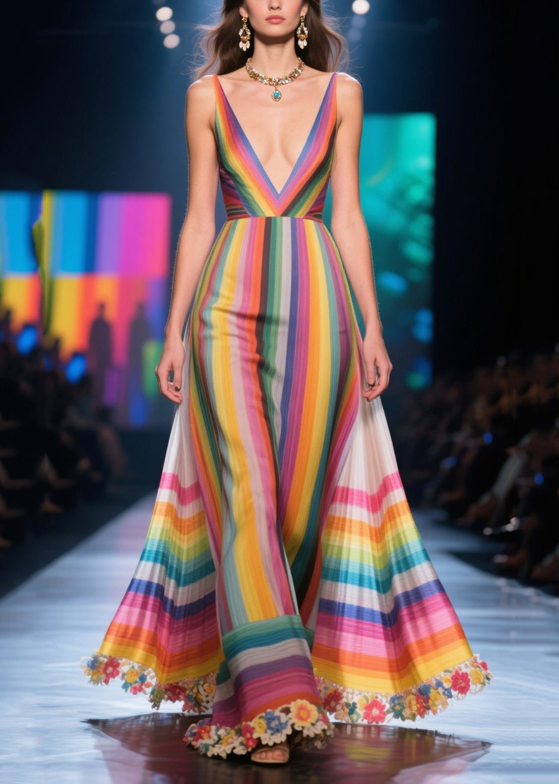 Art Rainbow V Neck Patchwork Flower Chiffon Party Dress Summer