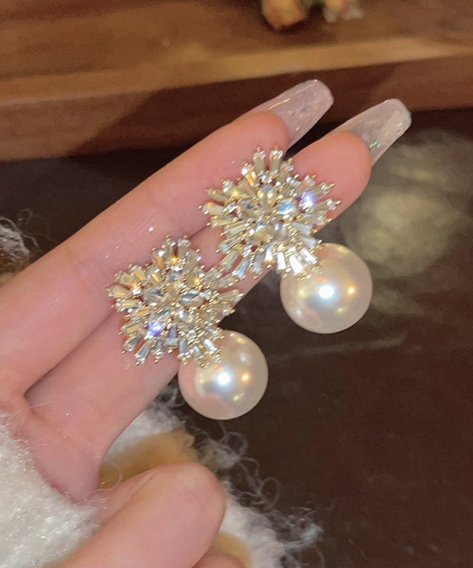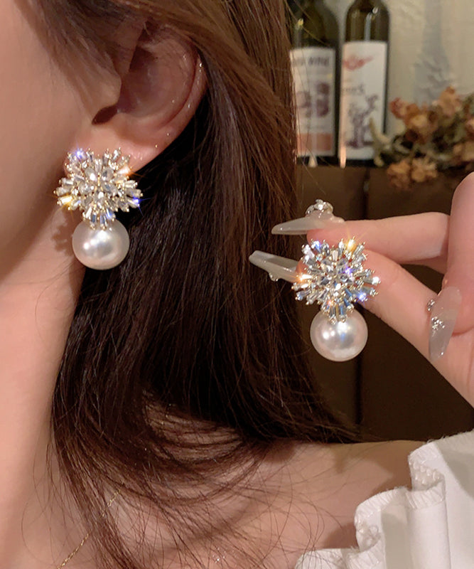 Beautiful Beige Copper Overgild Zircon Pearl Snowflake Stud Earrings
