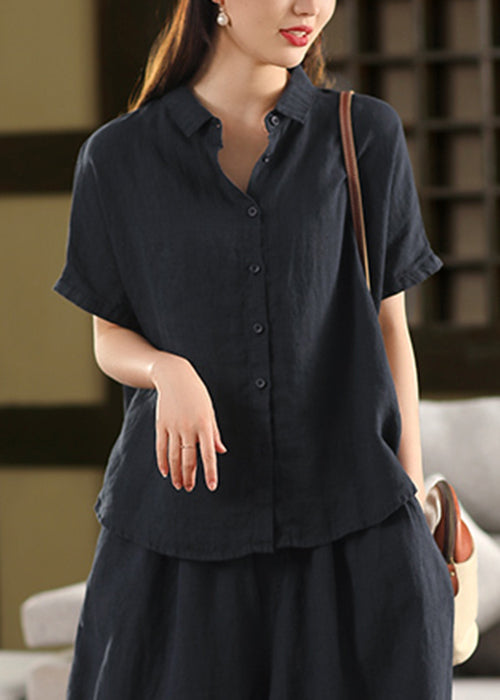 Black Button Solid Linen Summer Blouses Peter Pan Collar