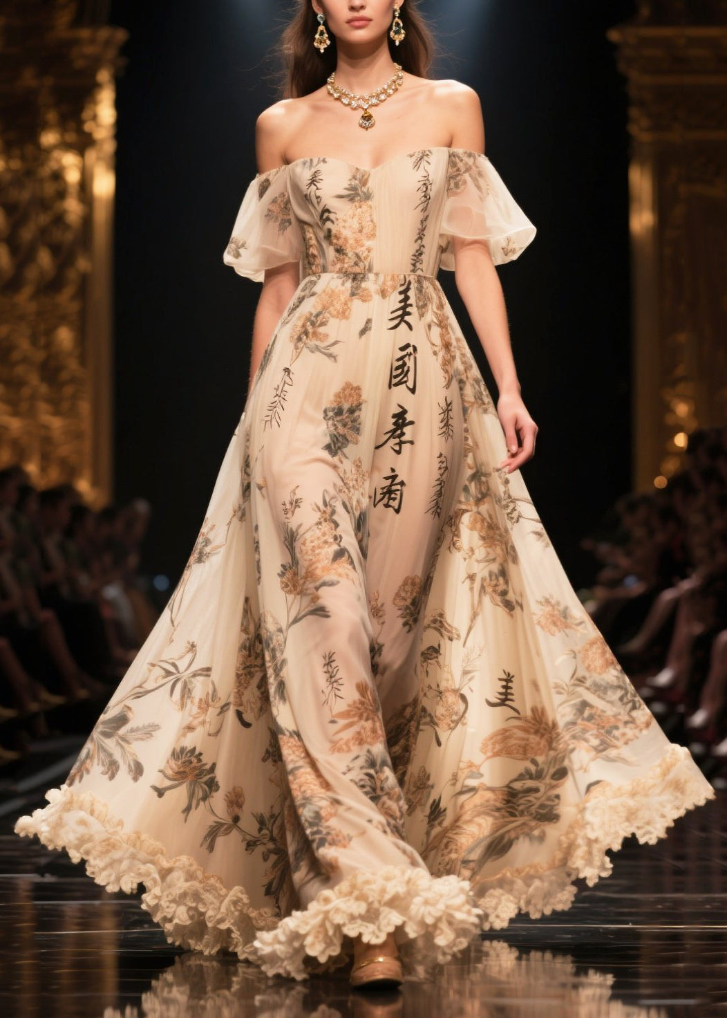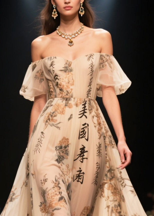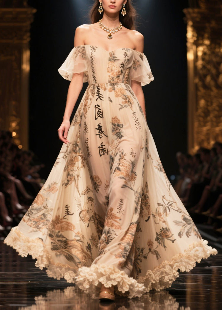 Bohemian Apricot Ruffled Print Exra Large Hem Chiffon Dress Summer