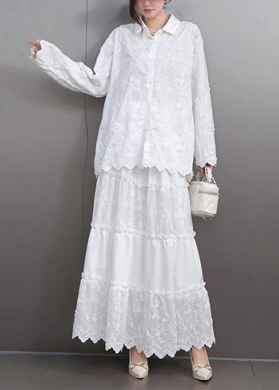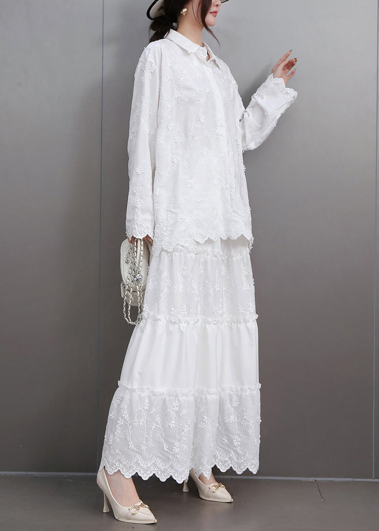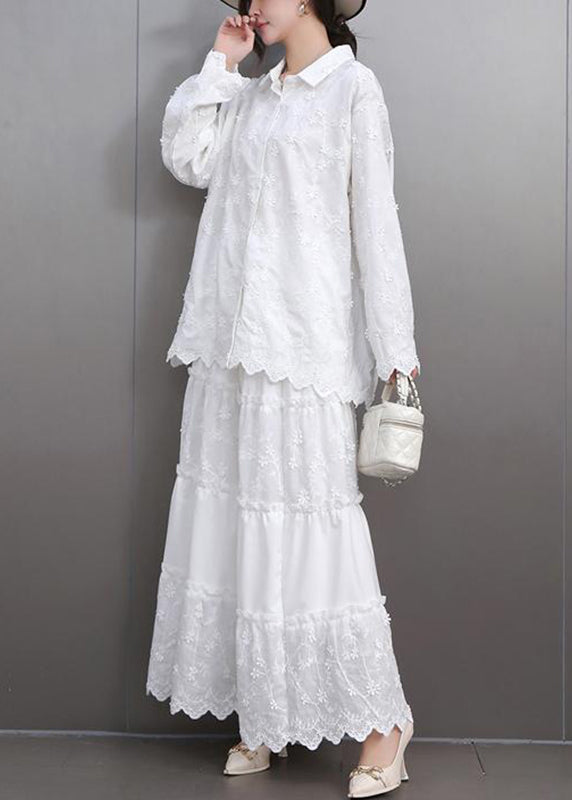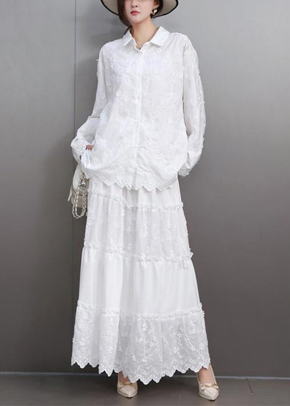 Boutique White Embroidered Floral Lace Shirts And Maxi Skirts Two Pieces Set Flare Sleeve