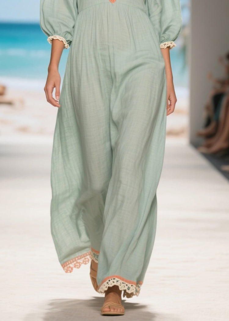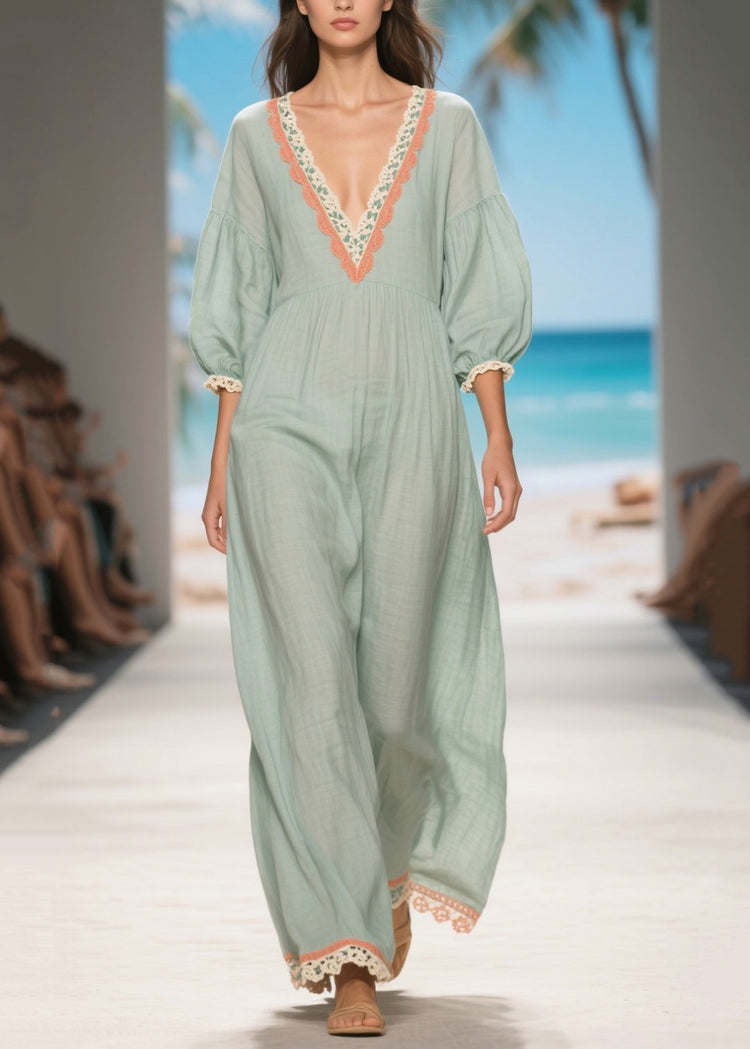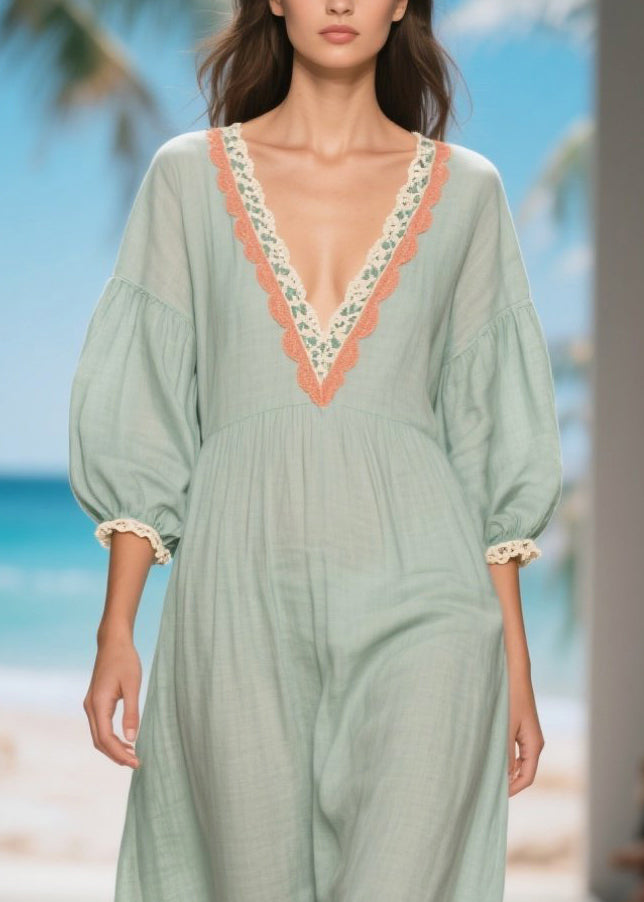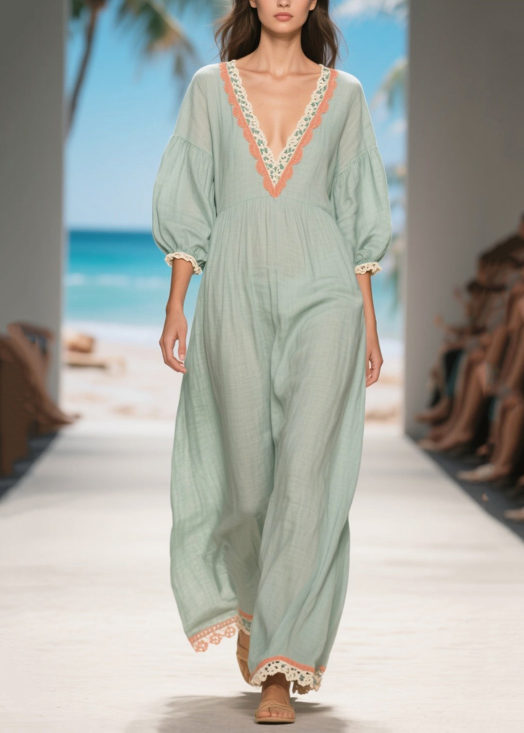 Casual Light Blue V Neck Patchwork Lace Linen Long Dress Summer