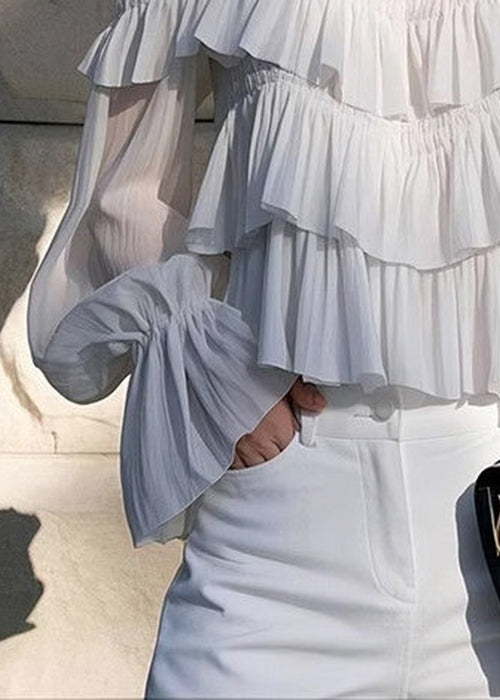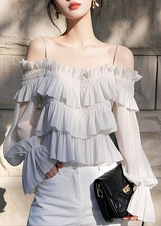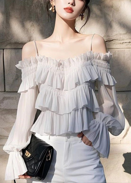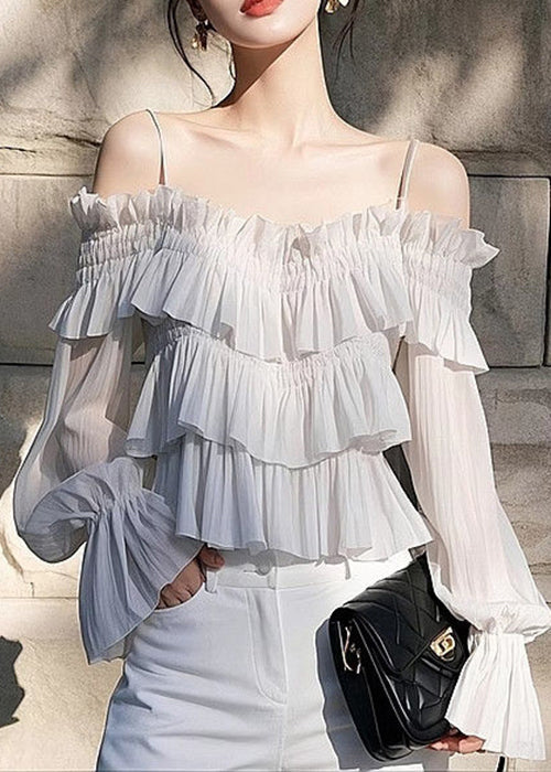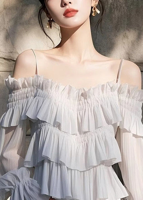 Chic Light Grey Ruffled Solid Chiffon Spaghetti Strap Blouse Flare Sleeve