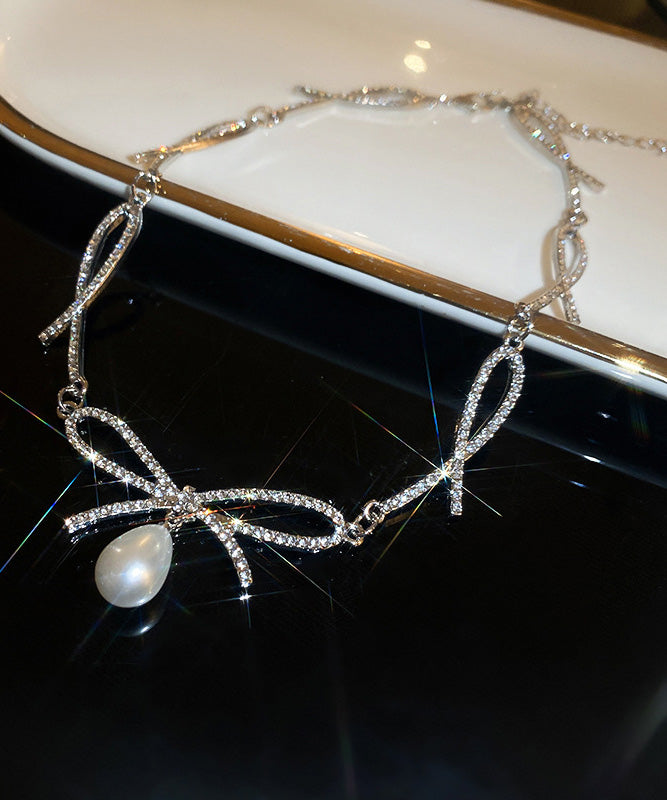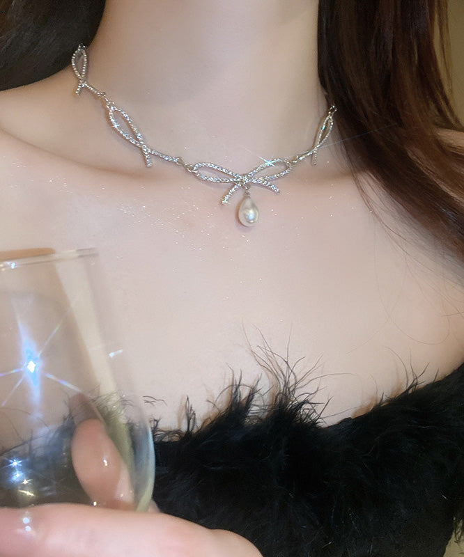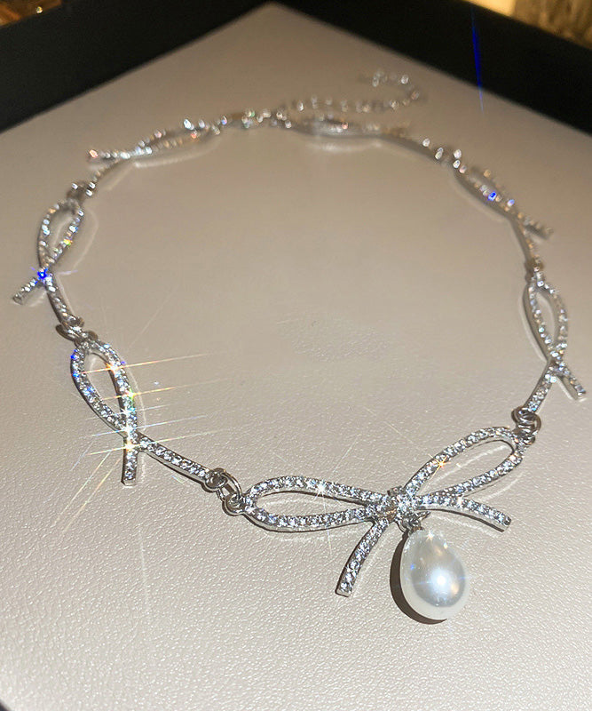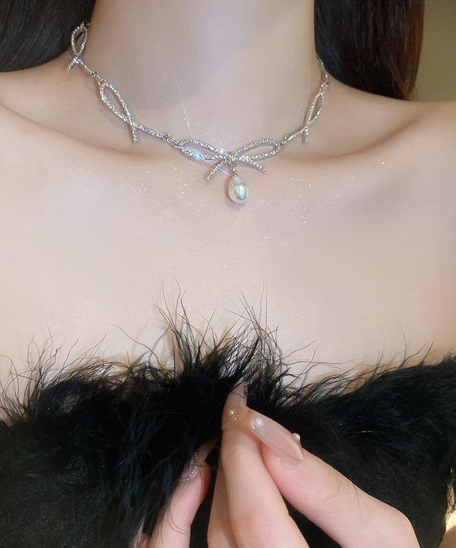 Chic Silk Alloy Zircon Bow Pearl Pendant Necklace