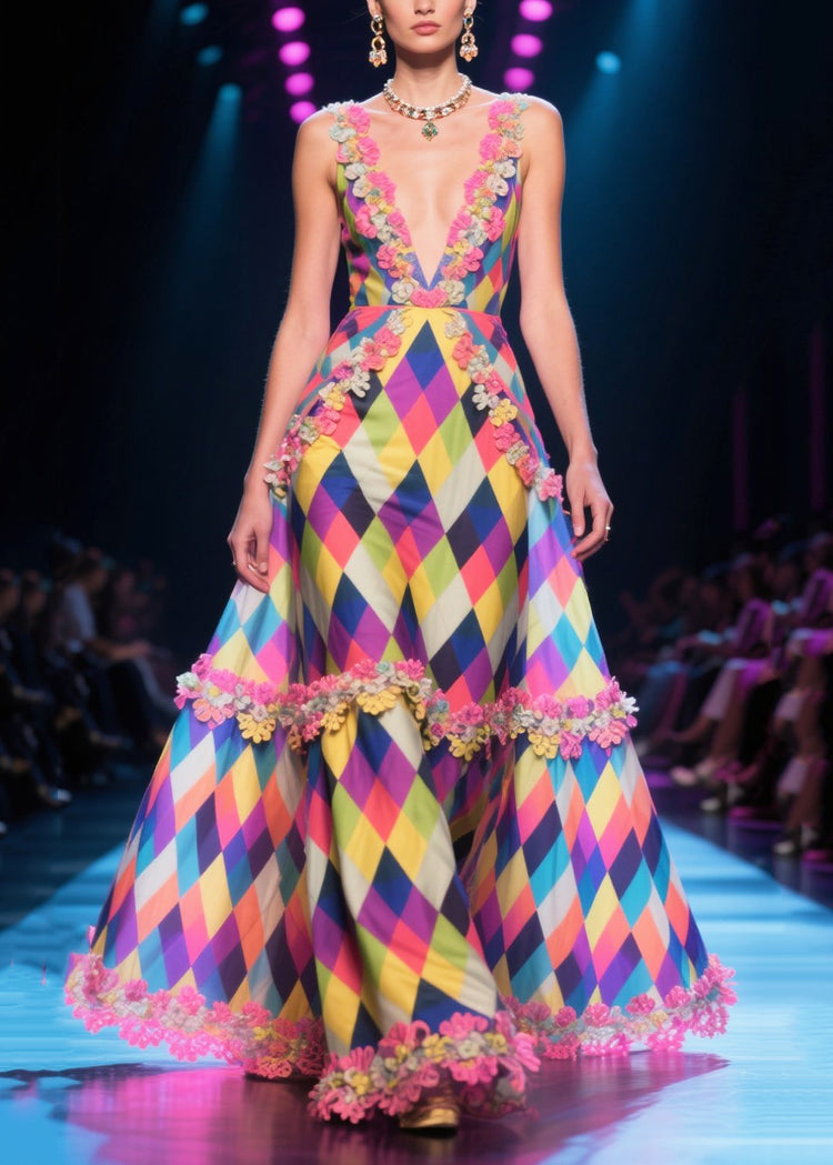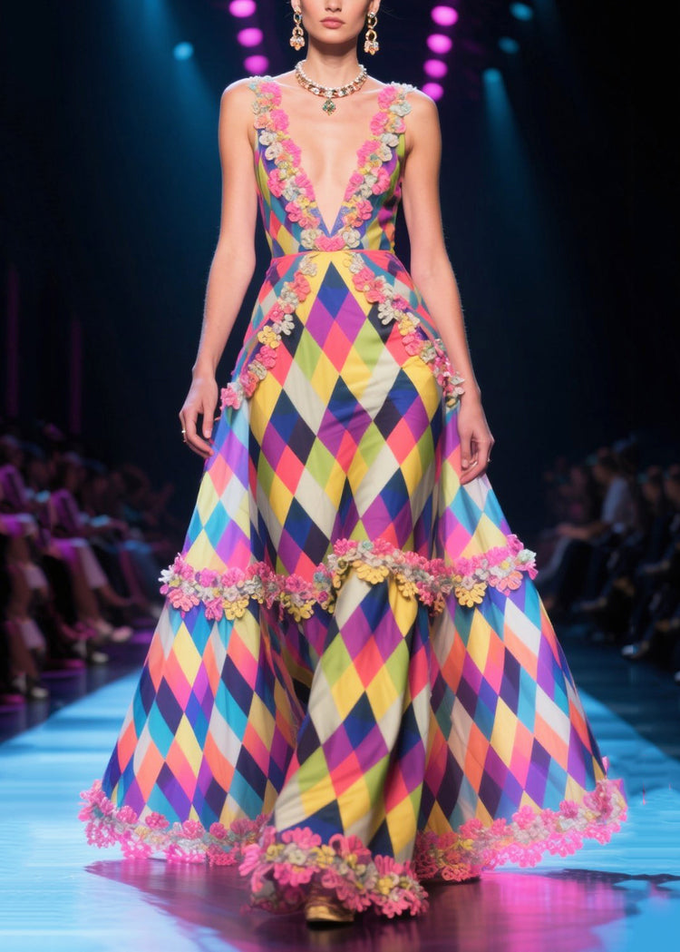 DIY Multicolour Plaid Patchwork Lace Chiffon Long Dress Summer