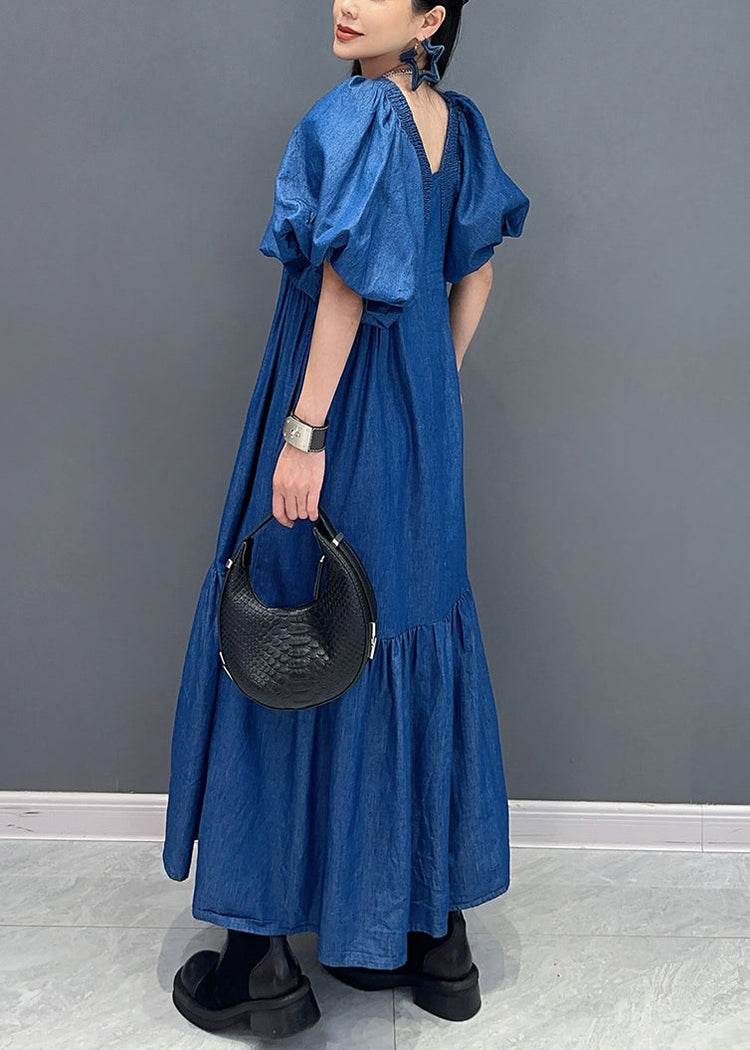 French Blue Wrinkled Patchwork Thin Denim Long Dress Summer