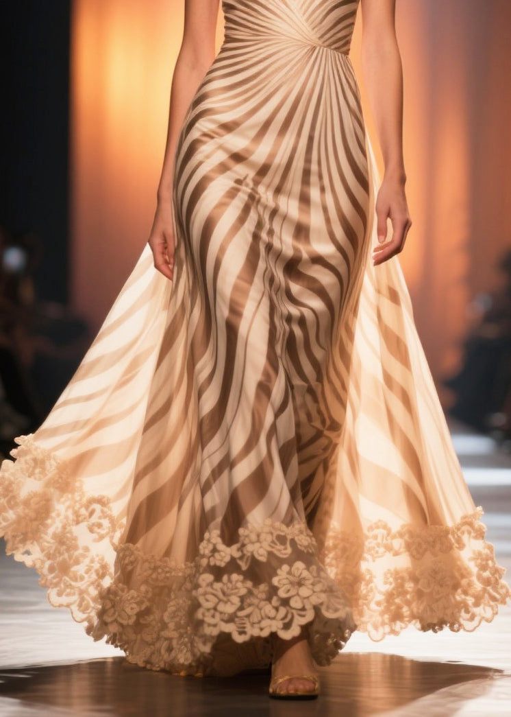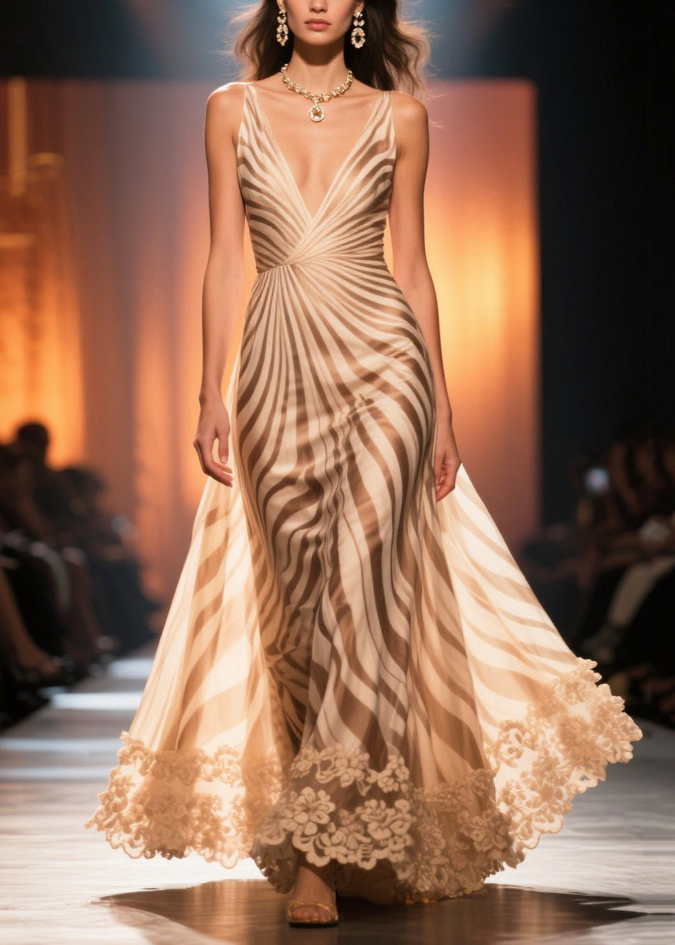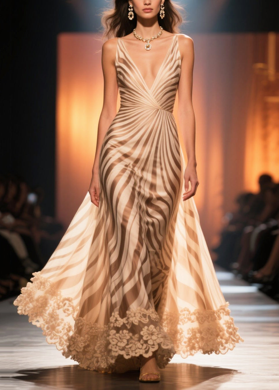 French Khaki Striped Exra Large Hem Chiffon Evening Dress Summer