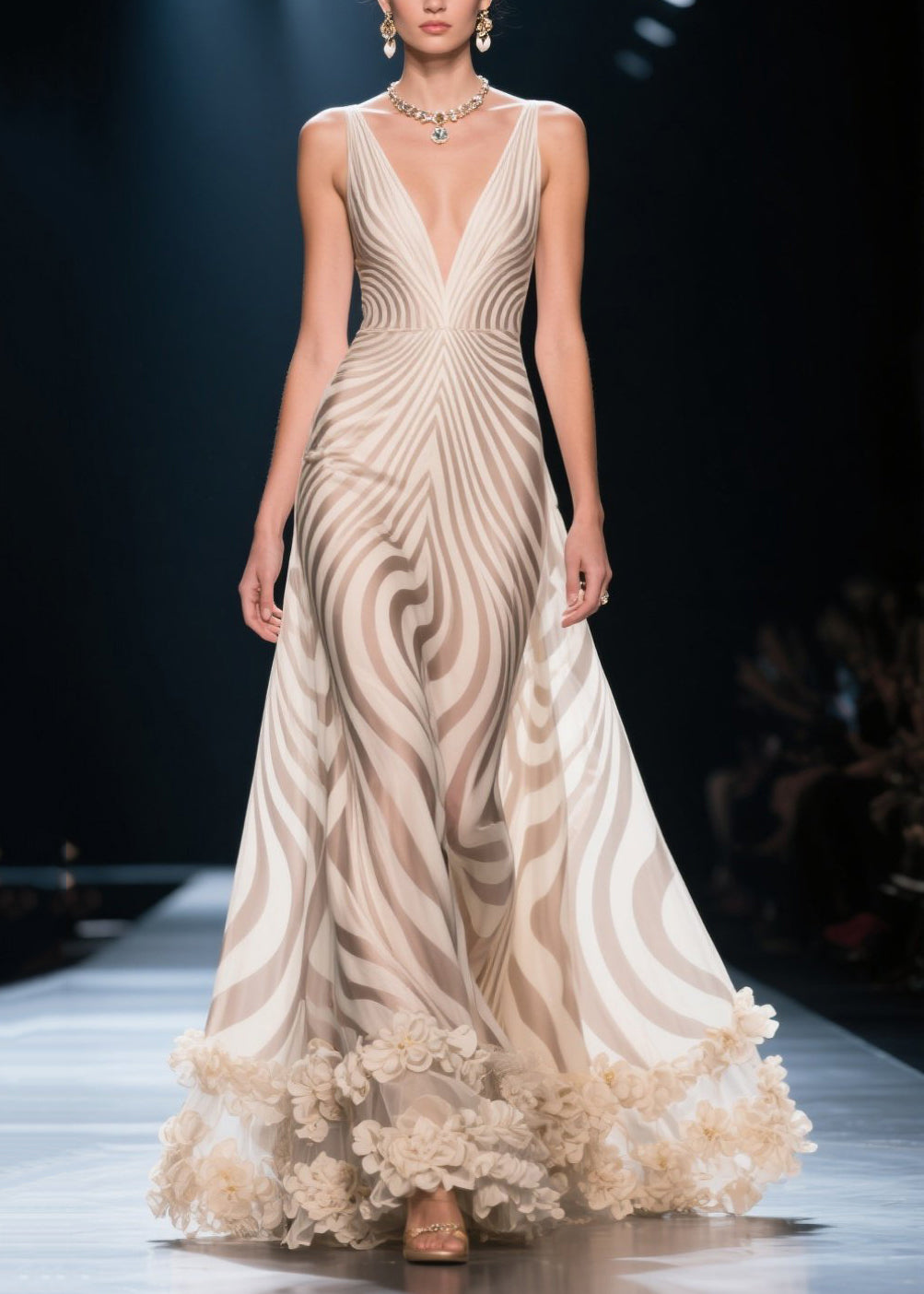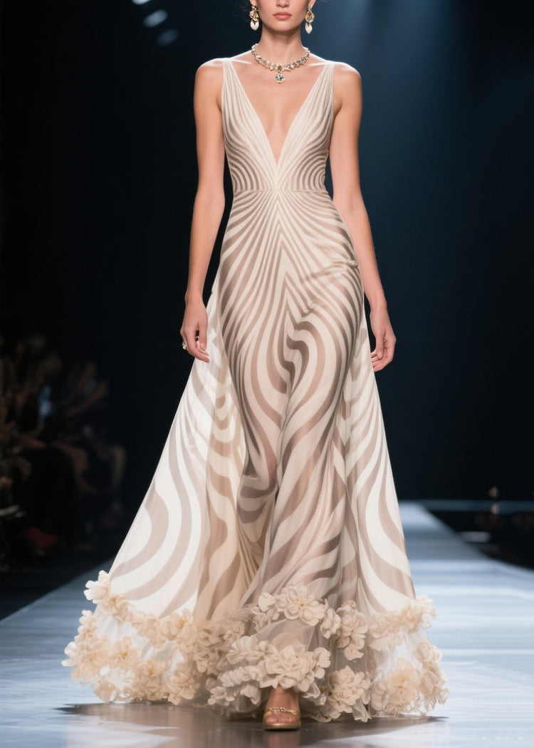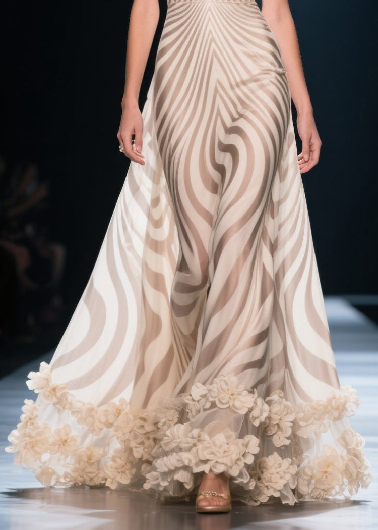 Italian Apricot Striped Flower Decorated Chiffon Cami Dress Summer