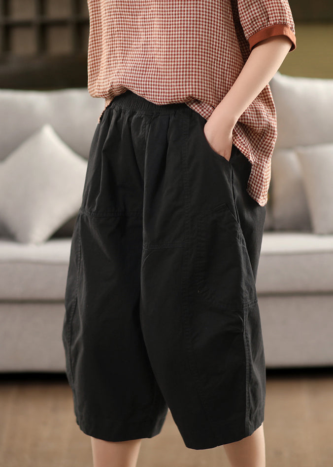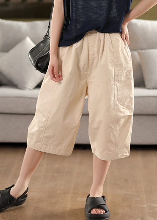Loose Beige Original Design Elastic Waist Solid Cotton Crop Pants
